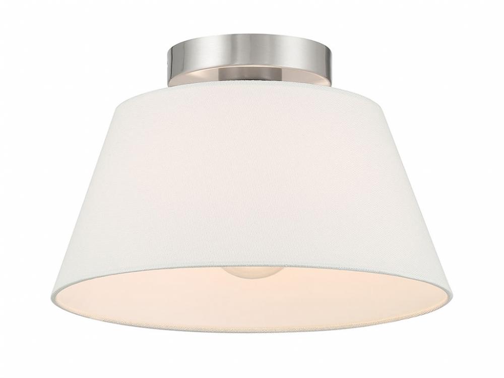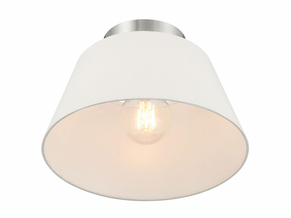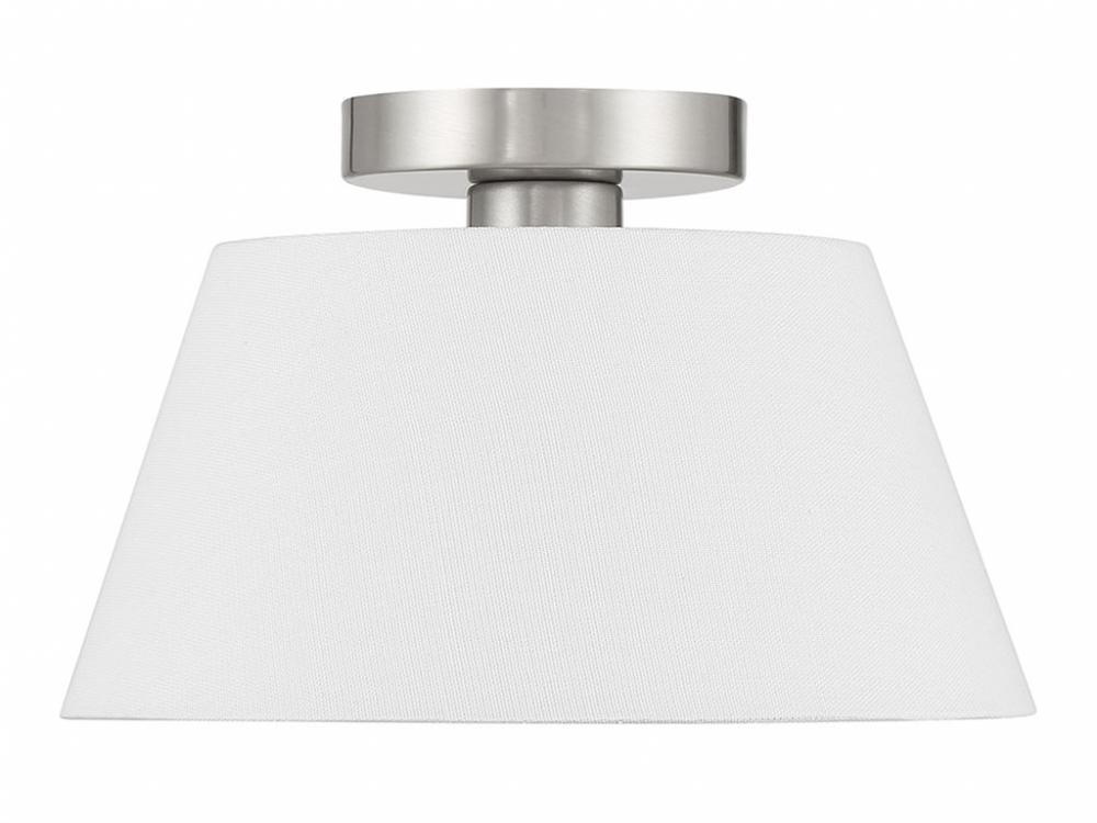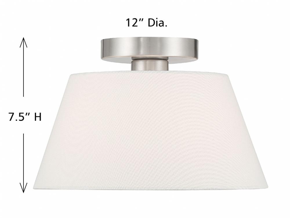 Use this 3-light ceiling semi-flush mount to freshen up any room. The elegant white linen shade provides a crisp and classic look that works beautifully with any decor and style. The Brushed Nickel finish is wonderfully versatile. 7.5" height, 12" width. Uses 1 standard size bulb of up to 60 watts. Bulb not included.
