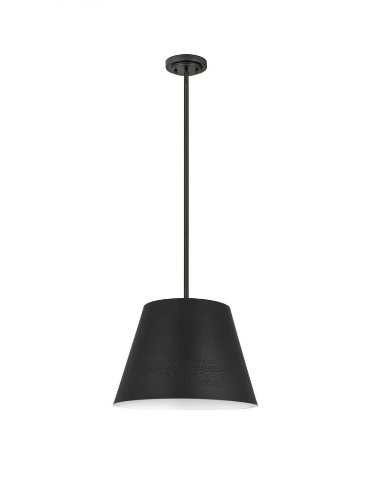 A texturized effect follows the hammered belt detail that changes up the look of this one-light pendant, creating a sleek artistic effect. Crafted of bold matte black finish iron, this pendant from the Maddox collection illuminates a custom casual kitchen, dining area, or living space with a classic industrial style. A matching down rod and canopy maintain design consistency.