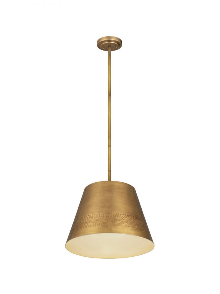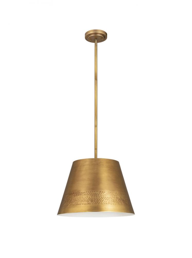 A texturized effect follows the hammered belt detail that changes up the look of this one-light pendant, creating a sleek artistic effect. Crafted of warm rubbed brass finish iron, this pendant from the Maddox collection illuminates a custom casual kitchen, dining area, or living space with a classic industrial style. A matching down rod and canopy maintain design consistency.