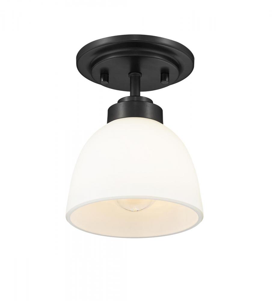 Make lighting work as a d?cor staple in a room devoted to easy living and solid taste from floor to ceiling. With a gorgeous Matte Black finish metal mount, this single-light flush mount ceiling light features a domed Matte Opal glass shade that creates a compelling silhouette and blends with surrounding furnishings.