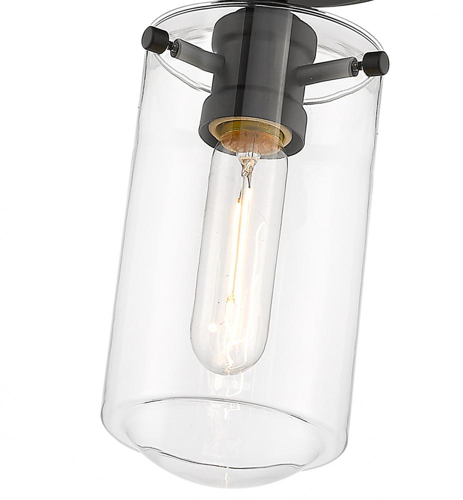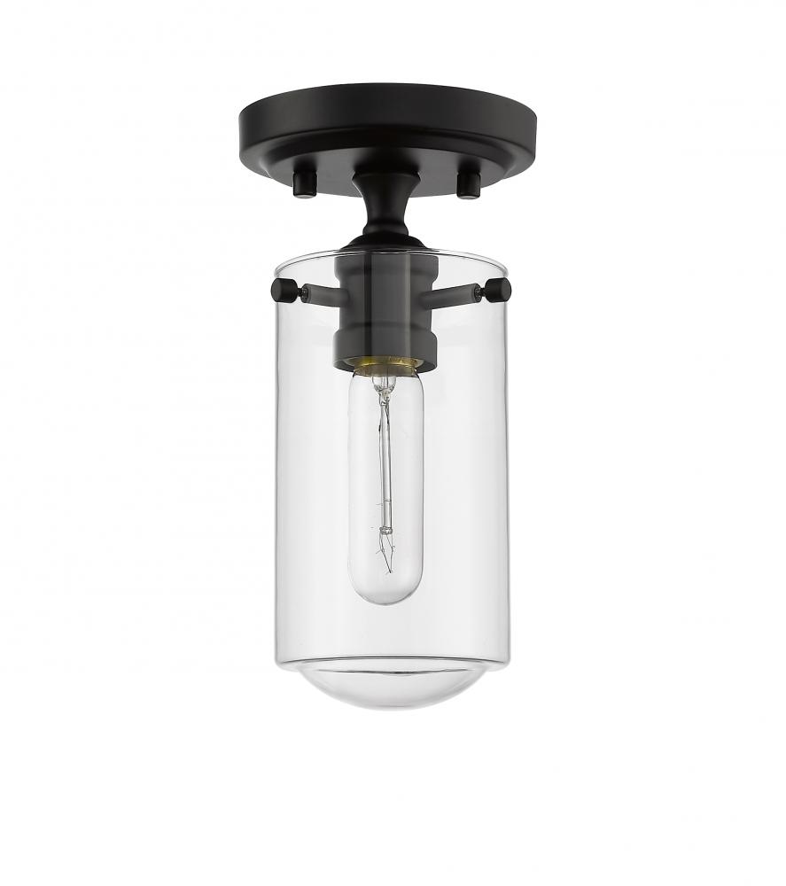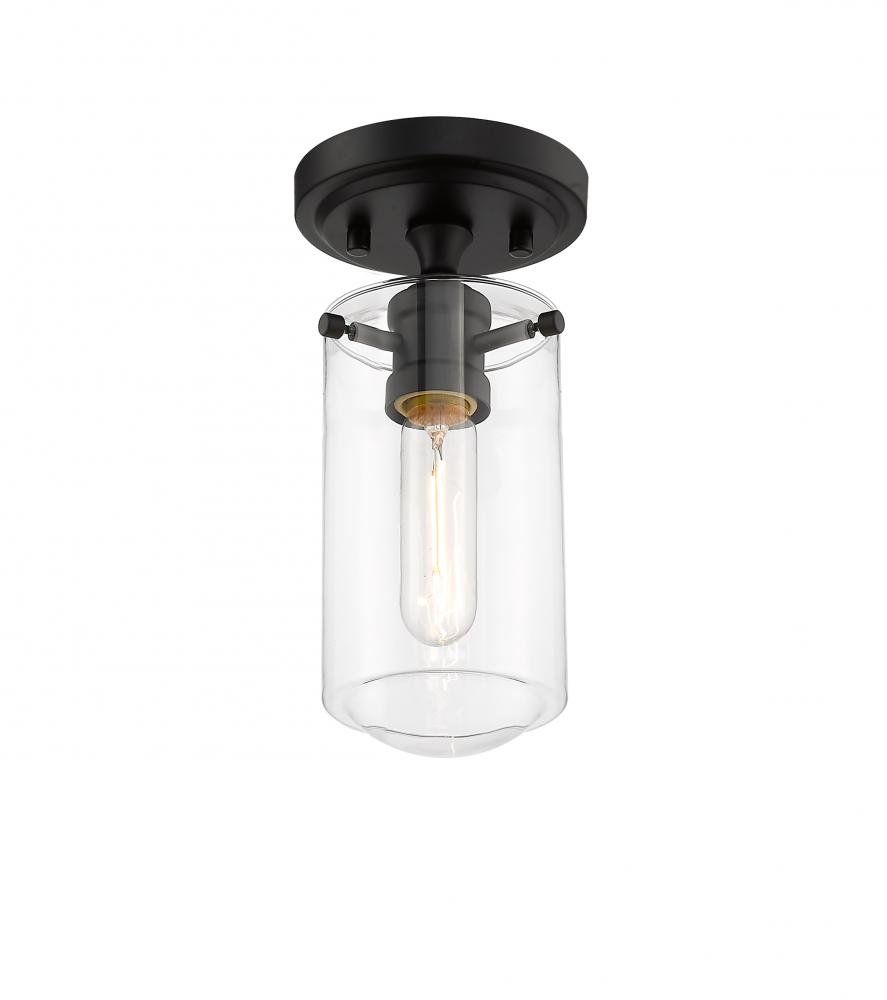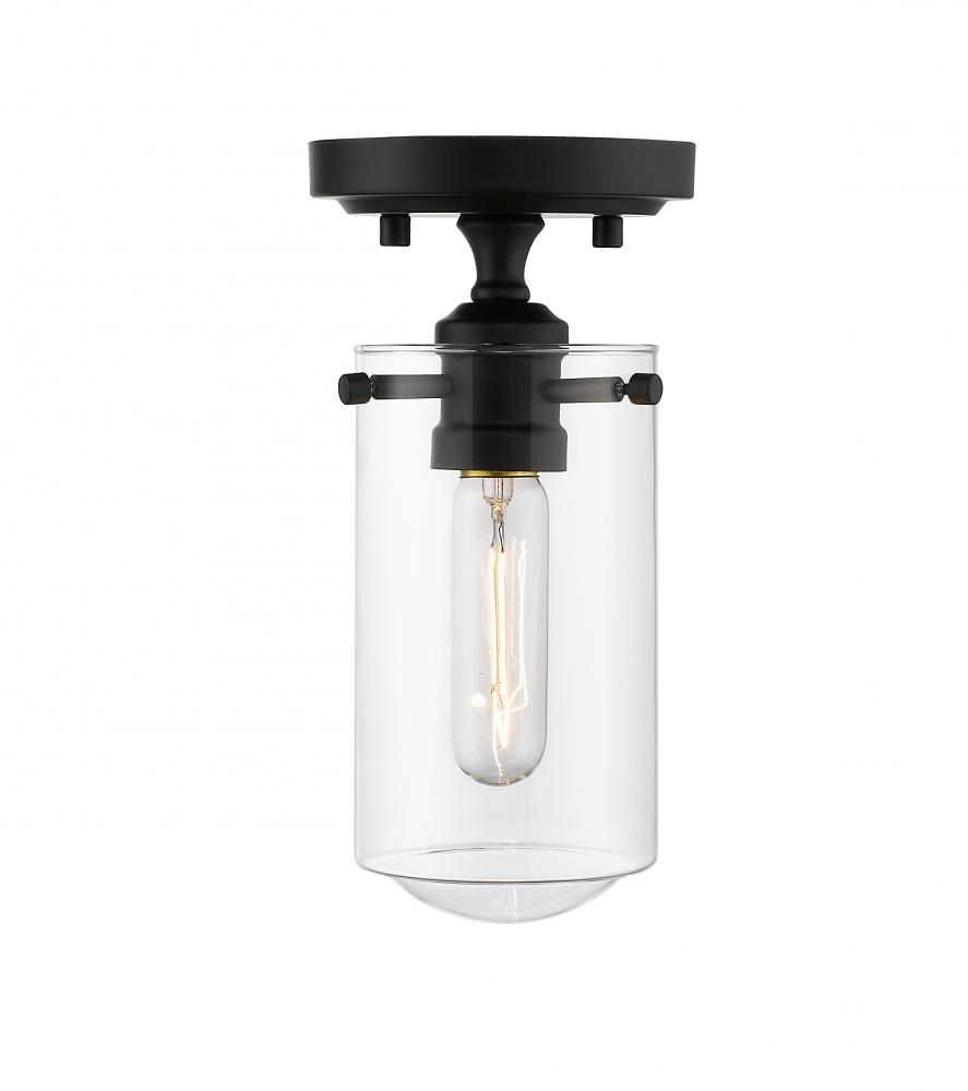 A clear, cylindrical glass shade allows the light to shine brilliantly from this modern, single-light flush mount fixture. Suspended from a round, matte black base, this elegant light is a stylish addition to a bedroom, kitchen, living room, or office.