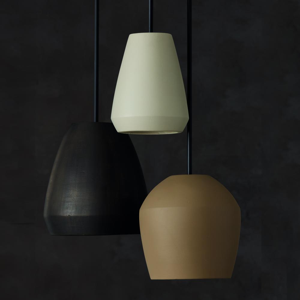 FINISH: A mixed material finish of handcrafted terracotta painted a bone ivory, plus neutral, dark, flat black metal.