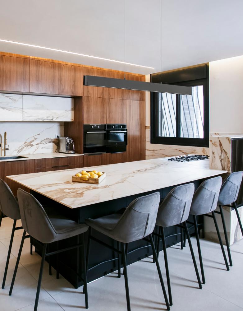 Energy saving LED lighting adds easy versatility and eco-friendly personality to the clean lines of a modern linear chandelier. Its the perfect shape for a kitchen island or rectangular dining table, adding bright, diffused illumination with a frosted diffuser. A matte black finish is crisp and refined, perfect for a variety of spaces and decor motifs.