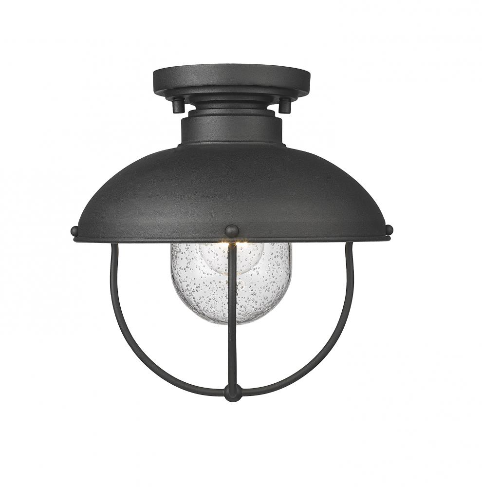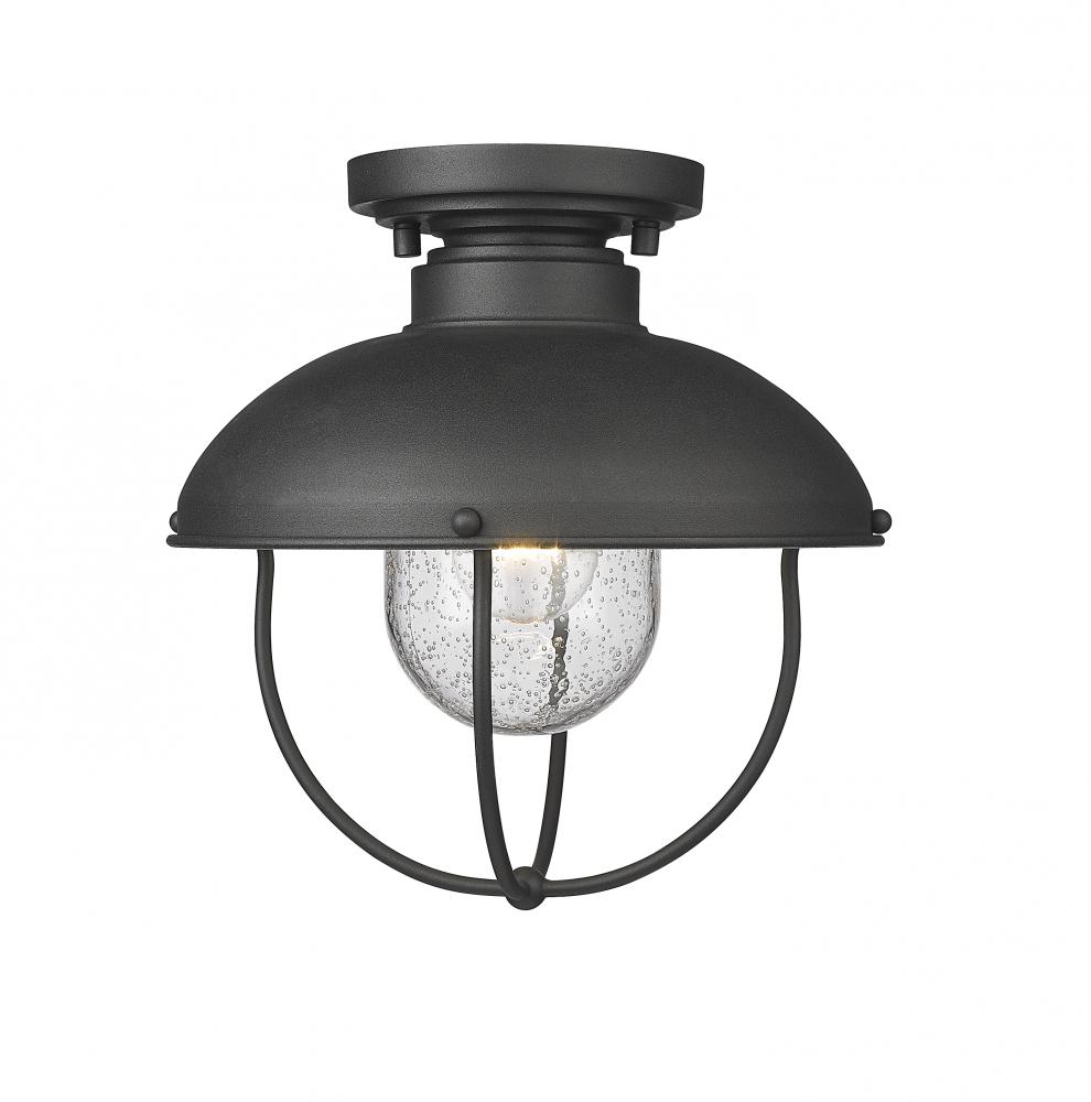Chic industrial aesthetics play a role in designing the Ansel single-light outdoor flush ceiling mount fixture, incorporating casual ease with a tasteful silhouette. Update fixtures in a covered patio or gazebo space with this light fashioned of black finish aluminum in a modified cage-style design blending with a half-dome hat shade. Modern in motif, this romantic light includes a medium glass shade.