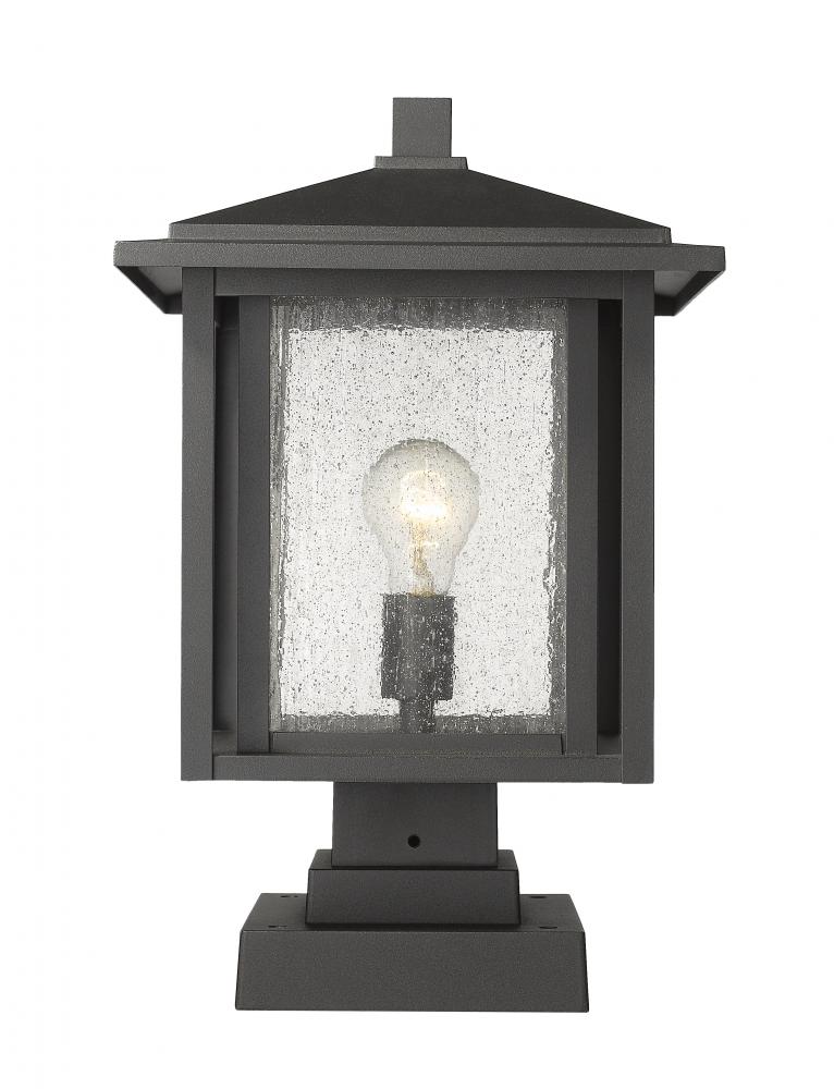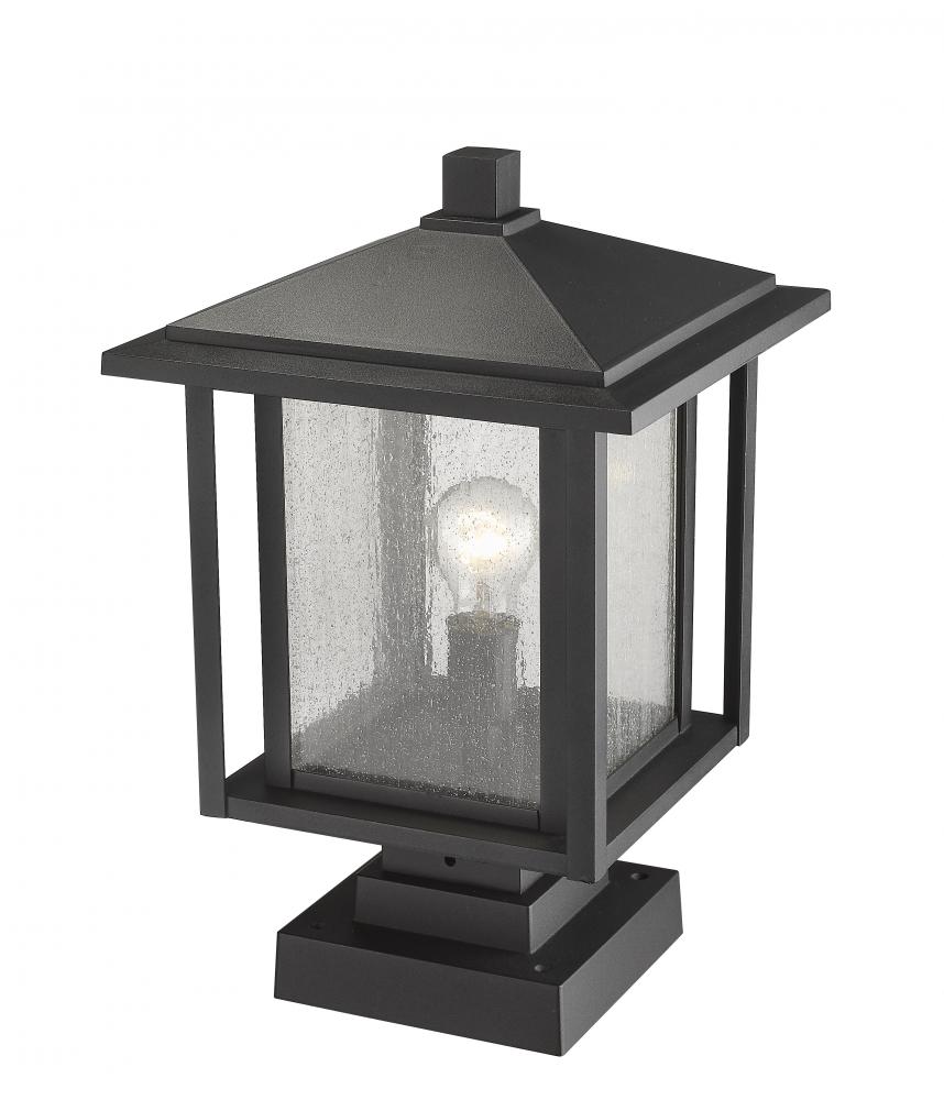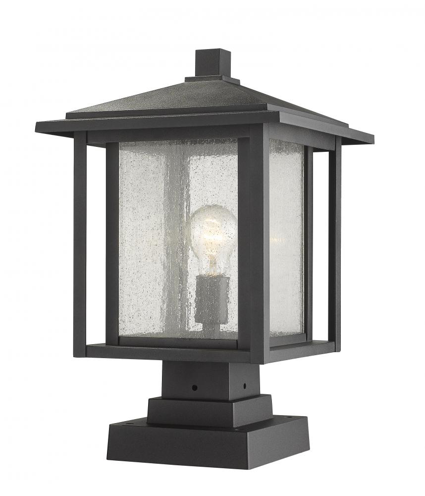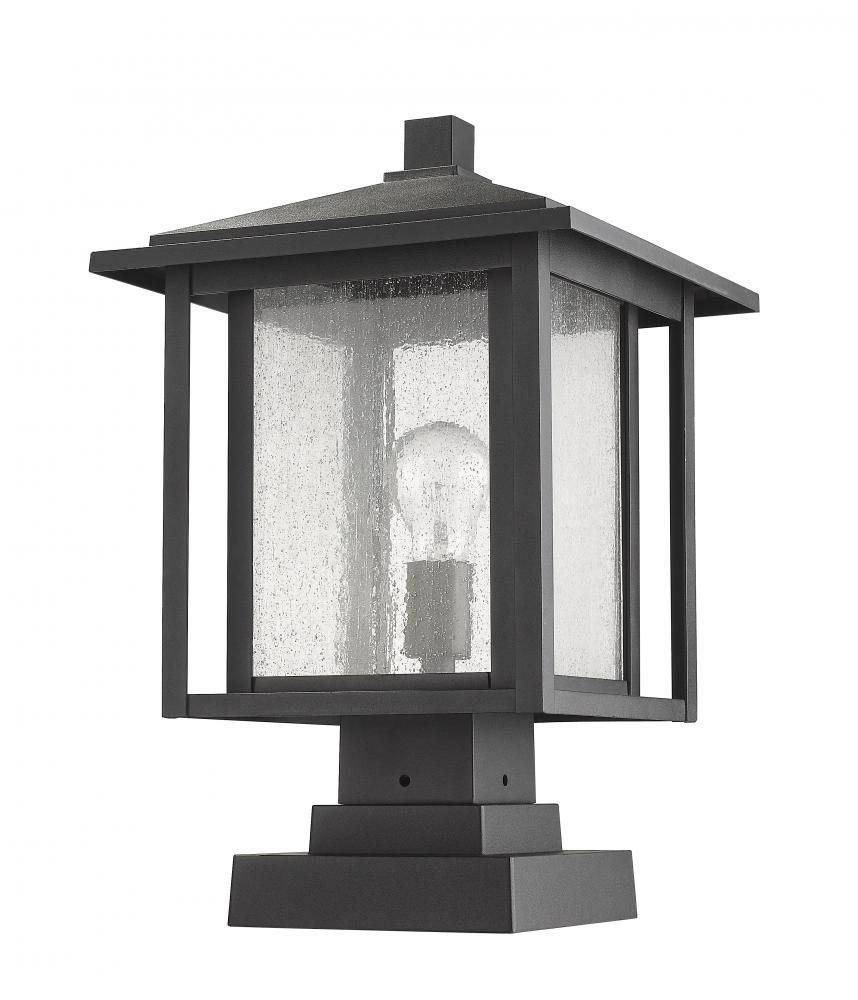 Add to the craftsman personality of an exterior space with this classic pier-mounted post light fixture. A charming village motif transforms sleek black matte finish aluminium in a dual frame over a seedy glass shade.