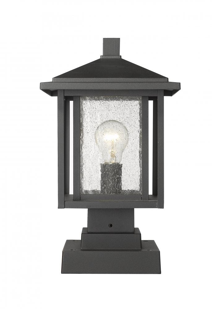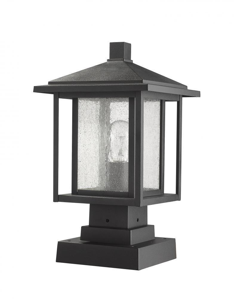 This handsome outdoor pier mounted fixture lends a modern twist to a classic form. Seedy glass creates a heady look in a shade nestled within a dual frame made from durable black aluminium.