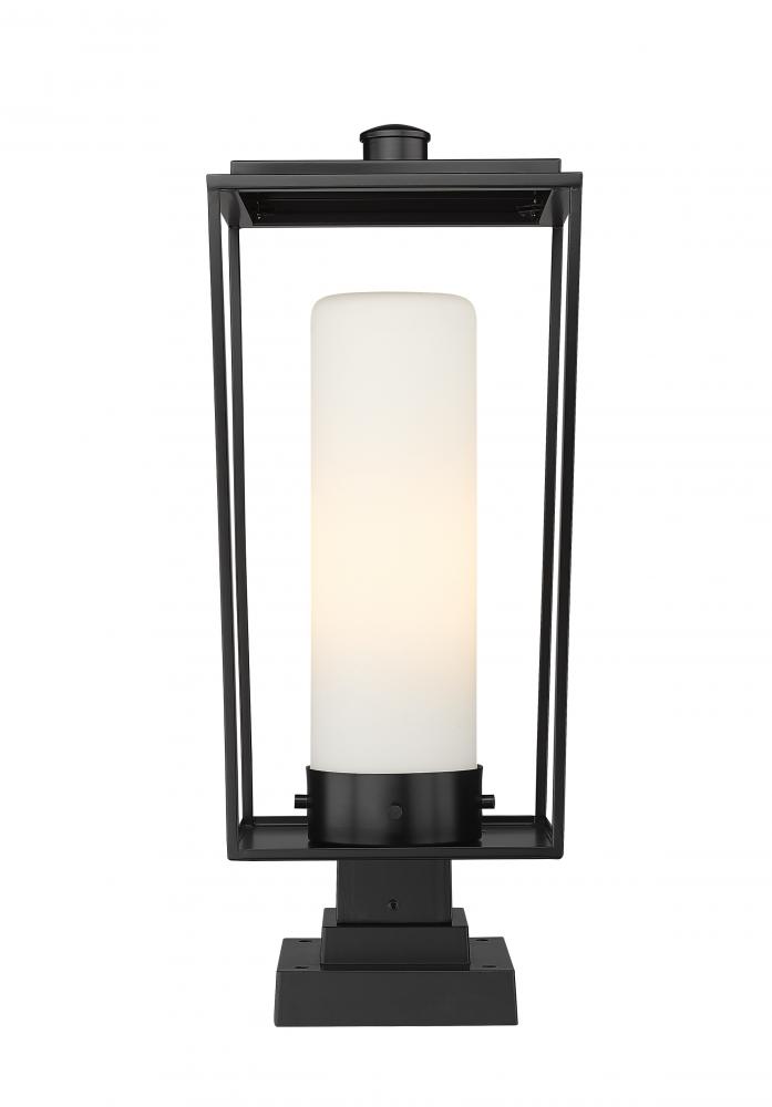 Charming updated village personality plays out in the design of the Sheridan one-light outdoor pier mounted fixture, adding an artisanal source of lighting to a custom landscaped space or walkway. Illuminate in style with a cylinder shade made of white opal glass and a contrasting open lantern-inspired frame formed of sleek black finish steel. This fixture sits atop a squared, stacked base.