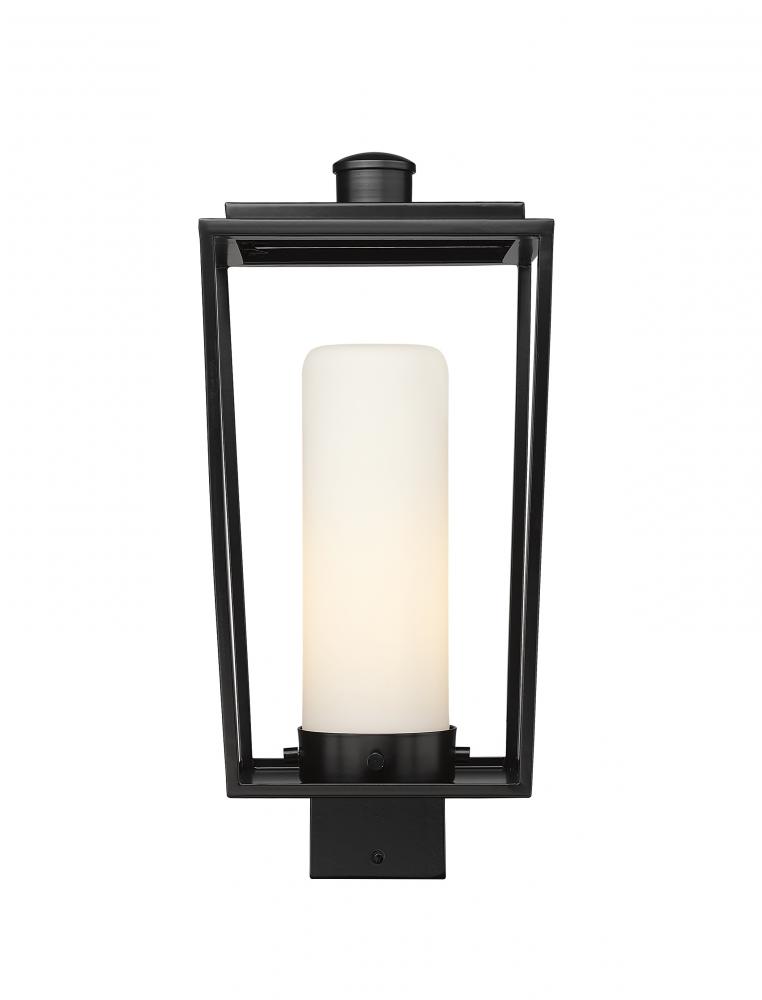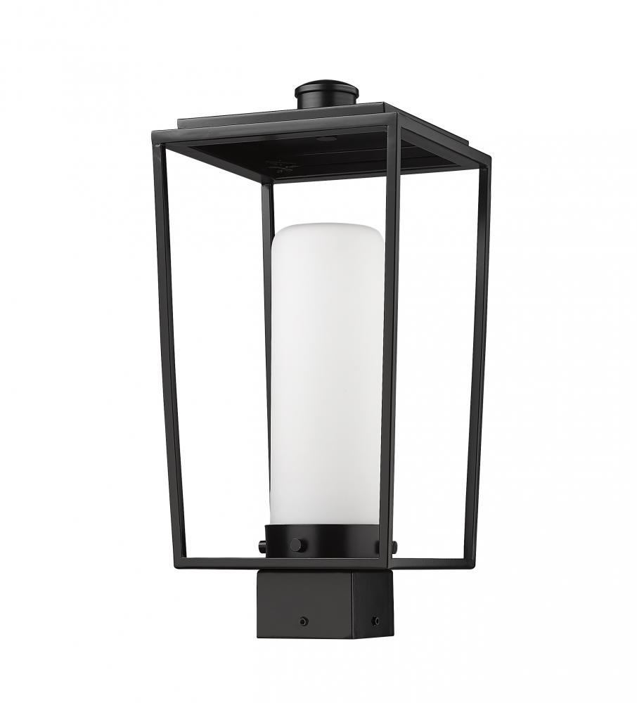 The Sheridan one-light outdoor post mount fixture tops an existing exterior post fitted with a squared opening. Repurpose outdoor lighting with this charming village-inspired yet modern theme featuring a black finish steel open box frame and accents, and a chic white opal glass cylinder shade that offers light diffusion.