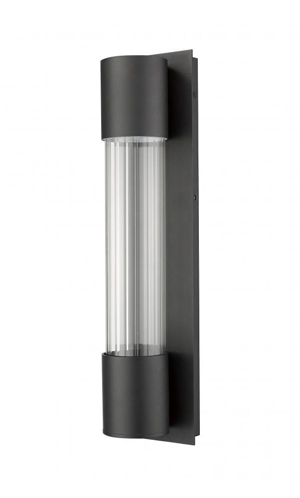 Black finish lends compelling presence to this medium wall sconce. Perfect for transitional spaces, this sconce boasts a cylinder profile complete with clear optic glass that delivers excellent illumination.