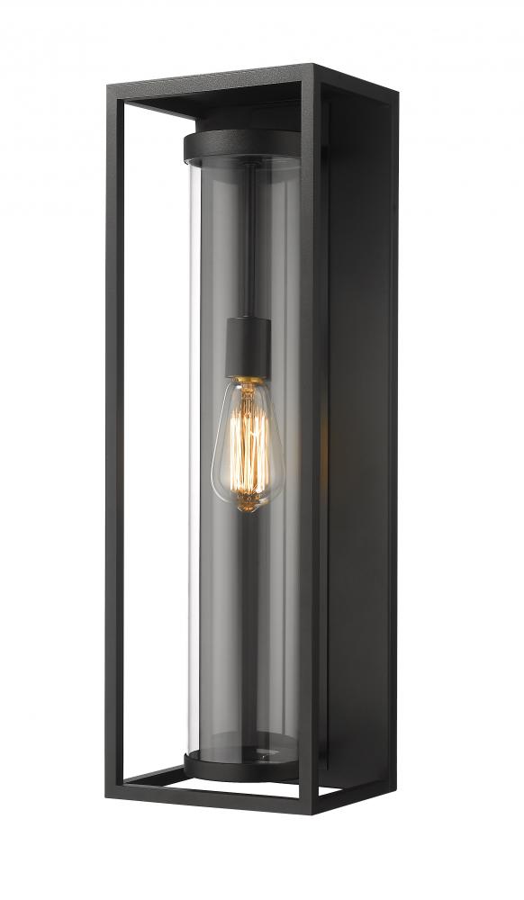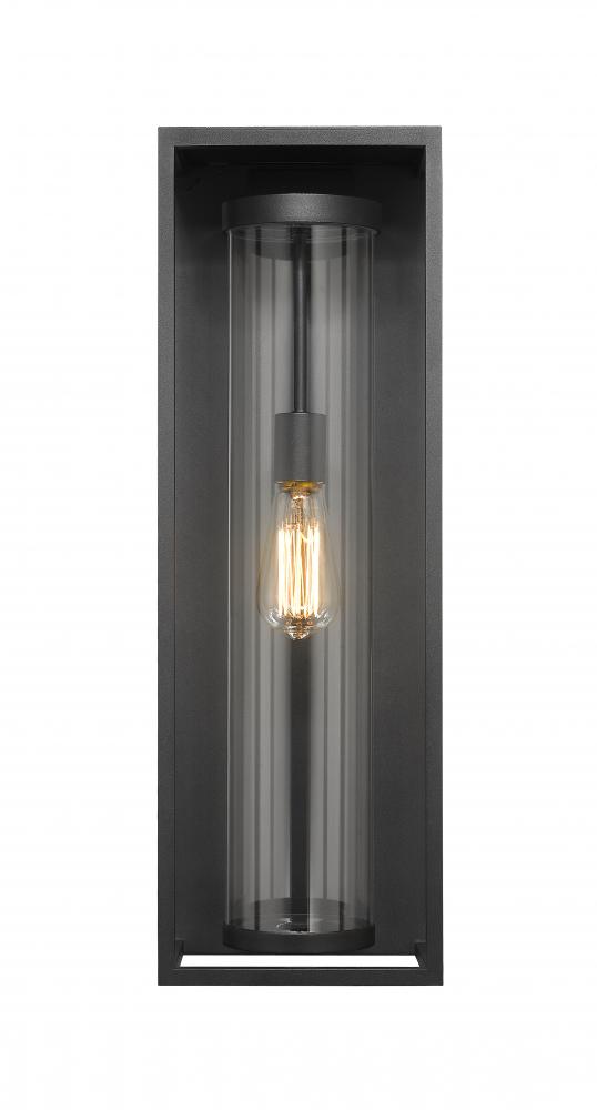 Minimal and understated, this modern outdoor wall sconce from the Dunbroch collection makes a wonderful addition to a veranda entertaining area. Its long box-like aluminum frame features three open sides and a black metal finish. Perfect for patios, a single drop down light protected by a clear cylindrical globe casts a soothing glow.