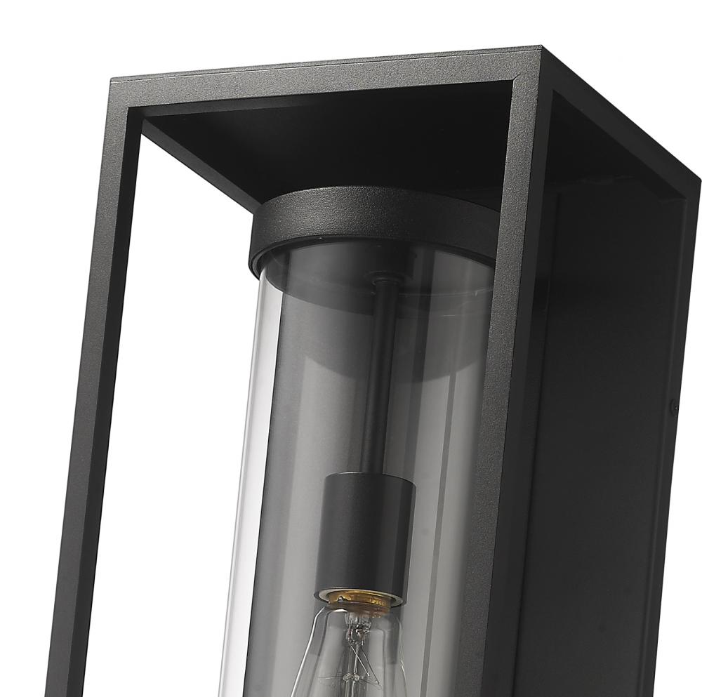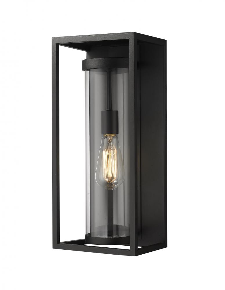 Minimalistic with a modern vibe, this contemporary outdoor wall sconce from the Dunbroch collection makes a striking addition to a porch entryway or patio entertainment area. Featuring a rectangular aluminum frame with three open sides, this outdoor wall sconce casts plenty of light all around. With a dark black finish and a single drop down light protected by a clear cylindrical globe, this outdoor sconce is quite versatile and complements a number of exterior materials.