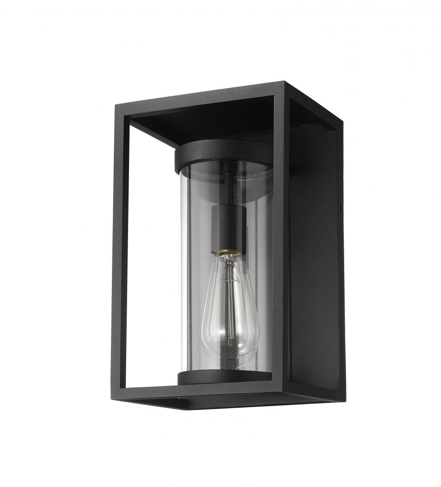 From the Dunbroch collection comes this minimalistic, modern outdoor wall sconce, perfectly suited for a porch entryway or patio entertainment area. Featuring an open rectangular aluminum frame as well as a single drop down light sheathed within a clear cylindrical glass globe, this sconce adds just the right amount of glow. Its striking dark black finish makes this exterior sconce able to complement existing building facades of various color palettes.