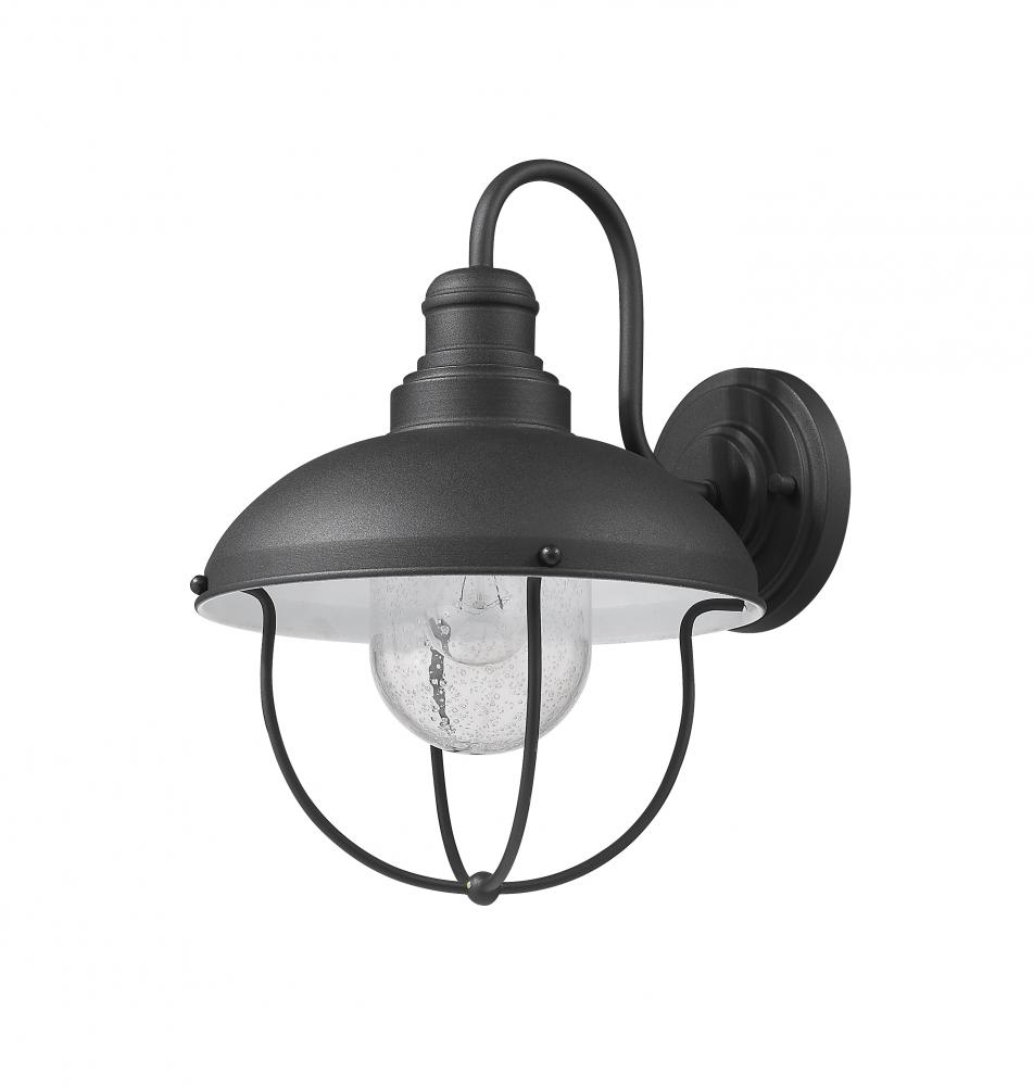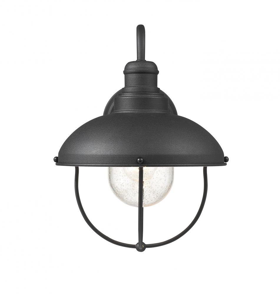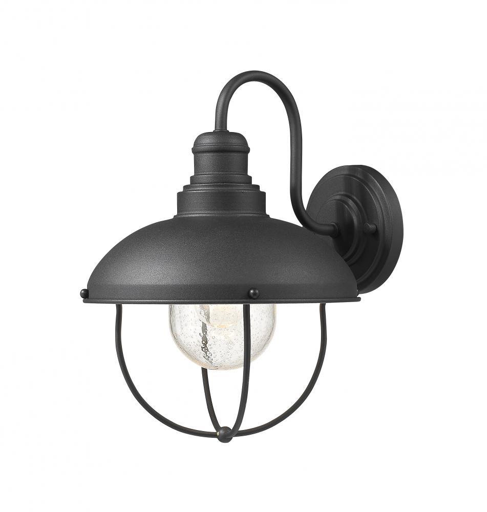 Village-inspired farmhouse charm mix motifs, creating an artful and tasteful vibe to the Ansel single-light outdoor wall sconce. Perfect for adding ambient and spot lighting on a structure or fence space, it features a black finish aluminum half-dome hat shade with a wire open cage-like element offering partial glimpses of a standard bulb.