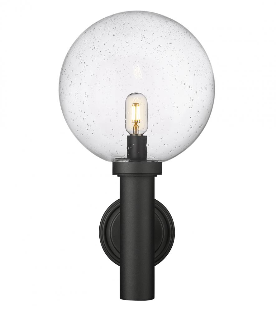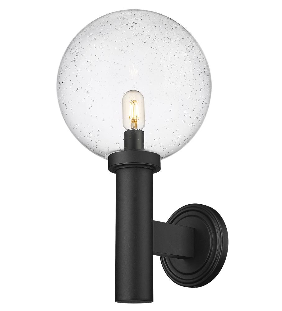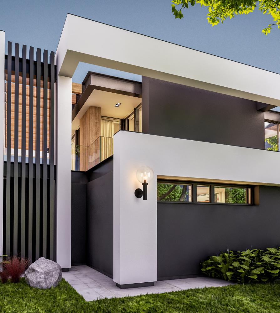 Indulge in a classic look of Mid-Century Modern attitude with an exterior light perfect for an updated house structure or deck space. From the Laurent collection comes a one-light outdoor wall sconce with a linear and circular blend of silhouetting. A simple yet tasteful black finish aluminum frame and wall plate hosts a chic globe shade fashioned of delicate clear seedy glass.