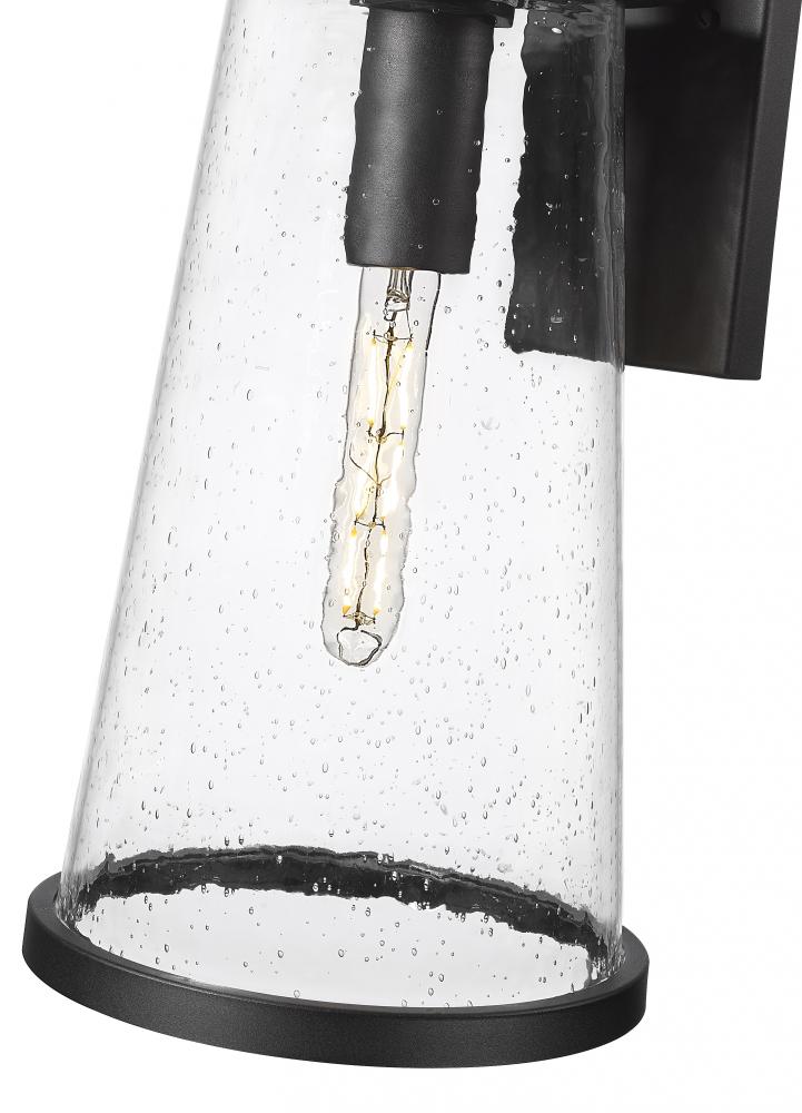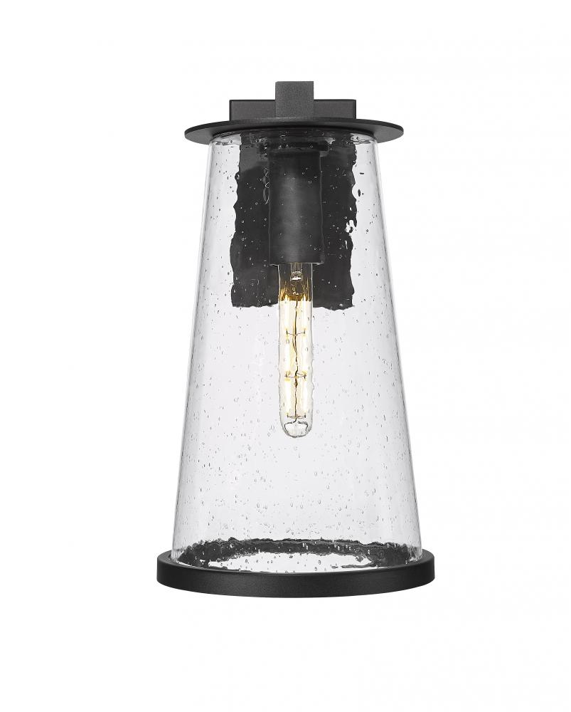 Distinctive rims encase clear seedy glass to create a bold, artistic look for a modern outdoor wall light from the Bar Harbor collection. Simply charming flanking a garage or front entryway, the light boasts a lantern-inspired silhouette streamlined for a contemporary ambiance that overflows with character. A marine-grade sand black finish is lasting and built for durability in outdoor environments, perfect for virtually any space.