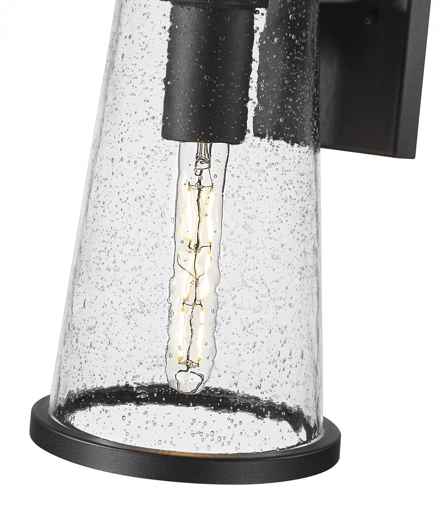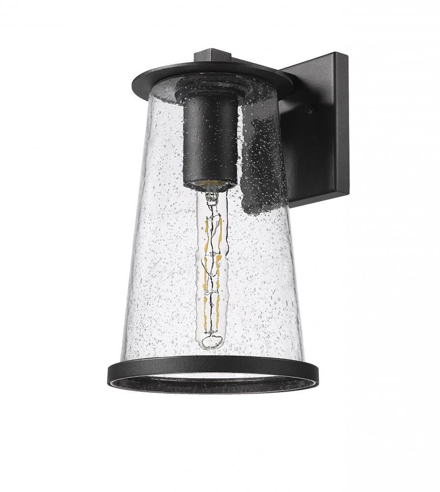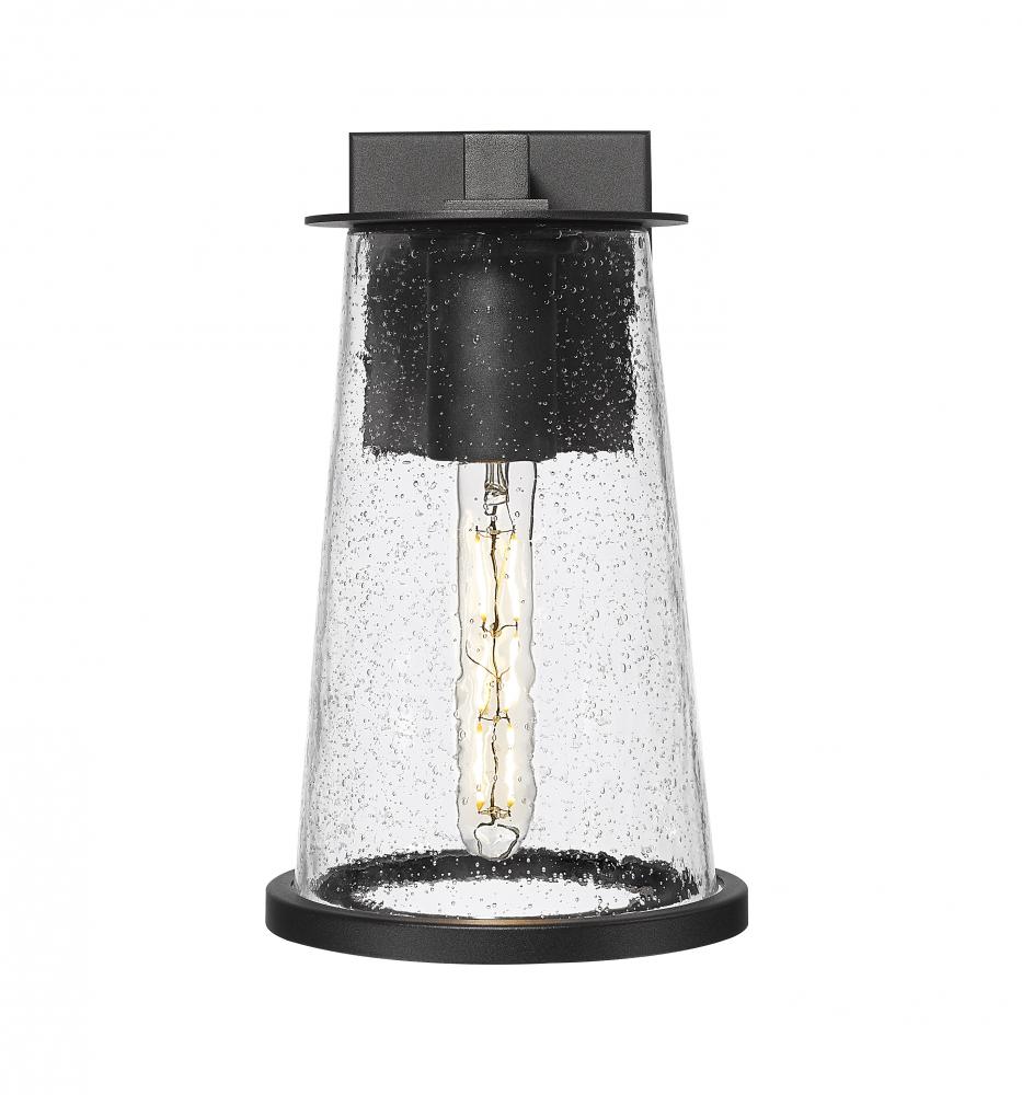 Clear seedy glass is rimmed in black to create a bold, artistic look for a modern outdoor wall light from the Bar Harbor collection. Simply charming flanking a garage or front entryway, the light boasts a lantern-inspired silhouette streamlined for a contemporary ambiance that overflows with character. A marine-grade sand black finish is lasting and built for durability in outdoor environments, perfect for virtually any space.