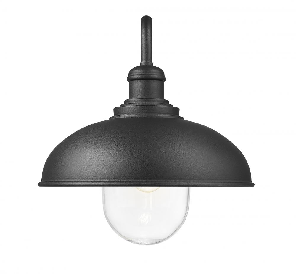 A capsule-style glass shade protects the light and offers charming flair to this modern industrial outdoor wall sconce. Designed with farmhouse character for inviting presence, it boasts a bold, decorative arm and domed shade, all in a textured sand black finish that adds durability you can count on.