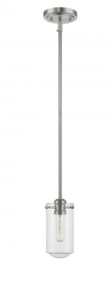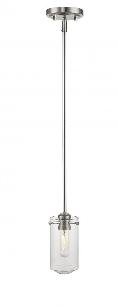 Clean lines and radiant metallic shine set this one-light pendant light apart from the others. Bright and modern, the elongated frame boasts a brushed nickel finish, streamlined with a clear glass shade.