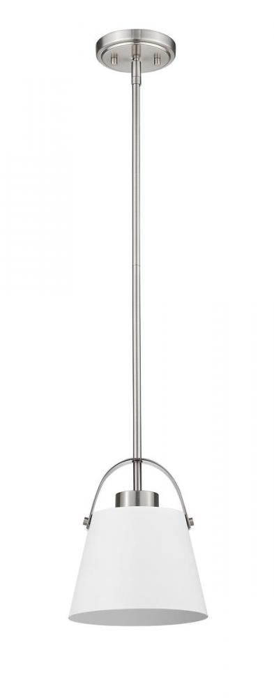 Incorporate design-forward illumination into a decadent contemporary d?cor scheme with this gorgeous one-light mini-pendant. Bring targeted lighting to a compact nook or reading space with a sleek fixture fashioned from Matte White and Brushed Nickel finish metal, with a classic angled shade.
