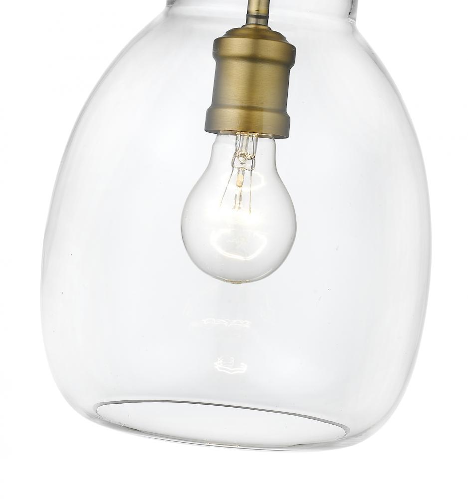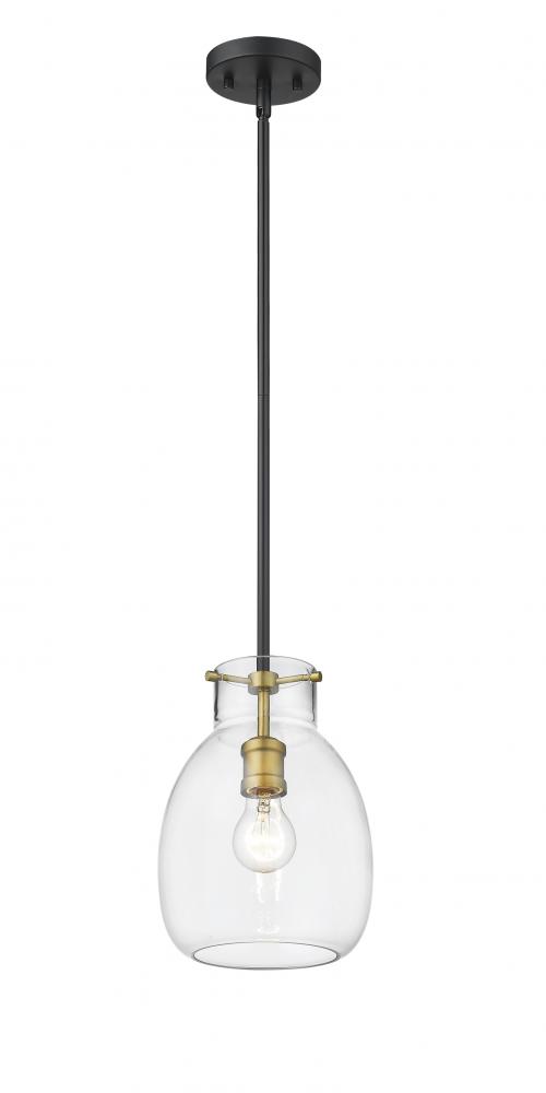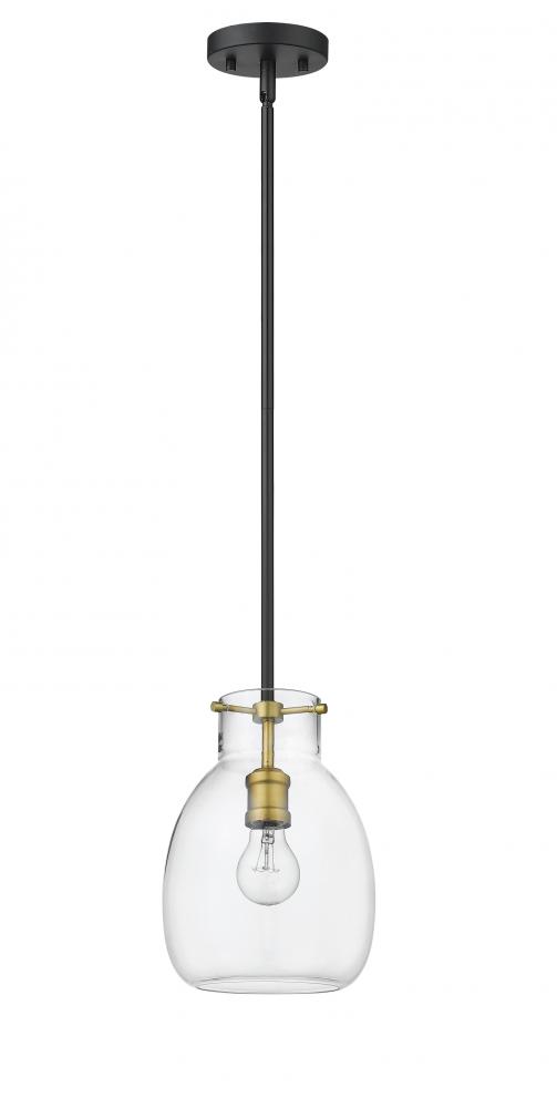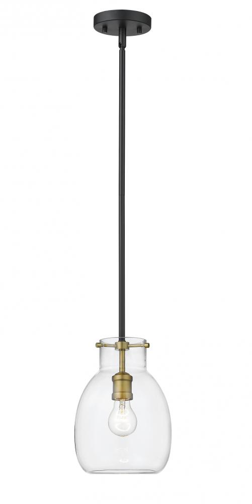 A sleek metal frame in a matte black finish blends elegantly with olde brass accents to give this single-light mini pendant a chic, modern look. Its clear glass shade casts a brilliant glow that beautifully illuminates any room.