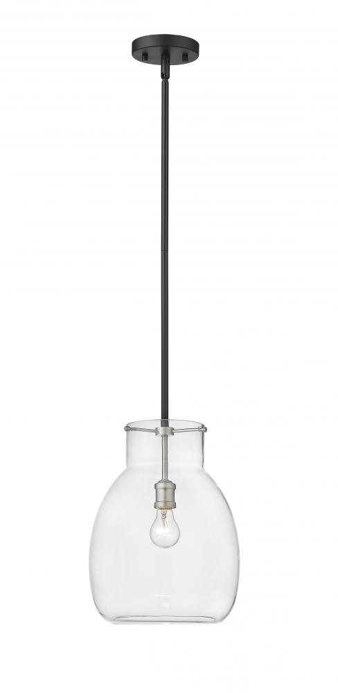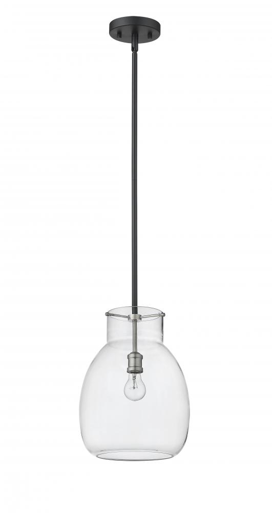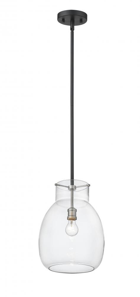 Gleaming brushed nickel accents blend with a sleek, matte black frame to give this single-light mini pendant a chic, modern look. Its clear glass shade casts a brilliant glow that beautifully illuminates any room.