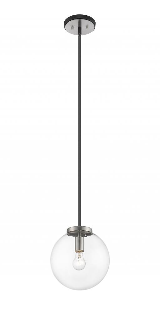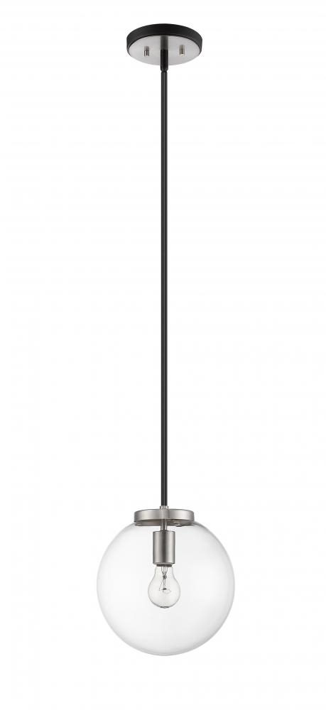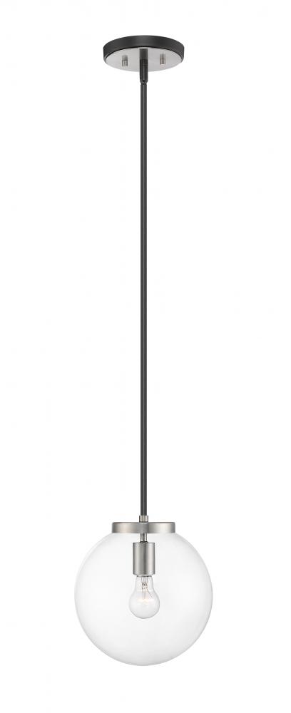 Clean, crisp lines and a slender design are the hallmarks of this one-light pendant for your home. Its fashioned with a matte black and brushed nickel finish and a round clear glass shade for the radiance youre looking for. This elegant light is perfect for the dining room, foyer, bedroom, or home office.