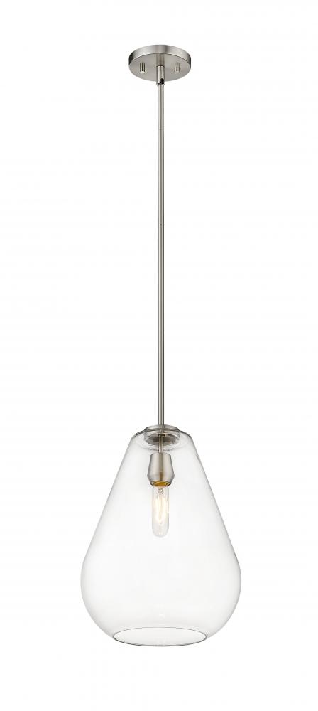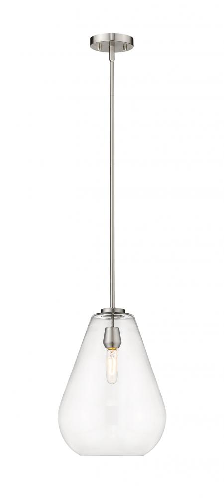 An eye-catching one-light pendant perfectly encapsulates the modern aesthetic. The tapered bell-shaped shade is made from clear glass, suspended from a steel frame with a sleek brushed nickel finish. The fixture brings a chic cutting edge to a contemporary kitchen or dining room.