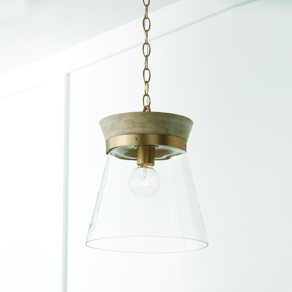 12"W x 14"H 1-Light Pendant in White Wash Wood and Matte Brass with Clear Glass