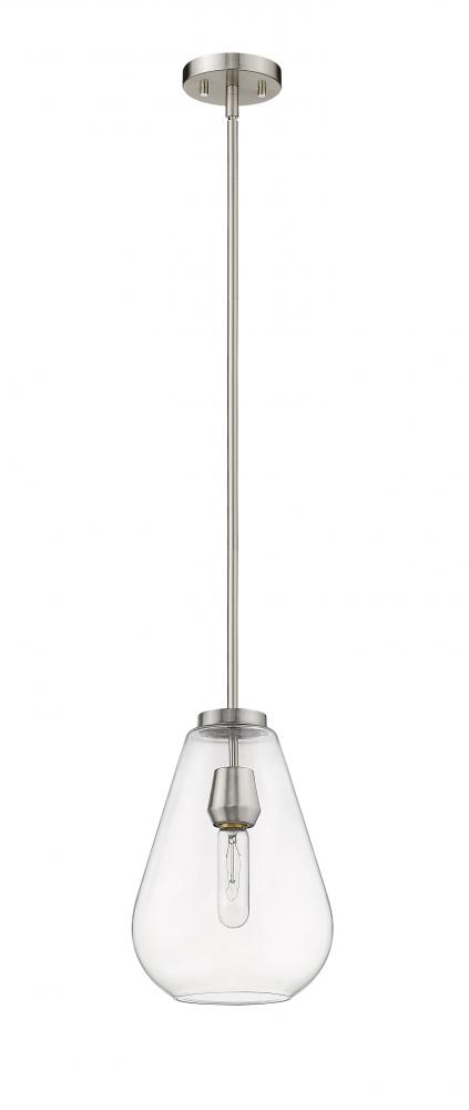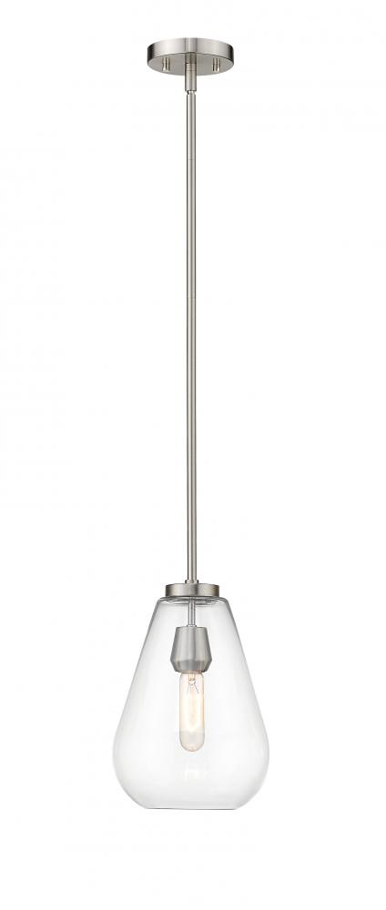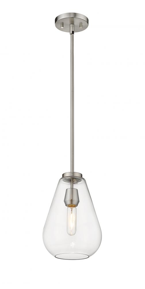 An eye-catching one-light pendant perfectly encapsulates the modern aesthetic. The tapered bell-shaped shade is made from clear glass, suspended from a steel frame with a sleek brushed nickel finish. The fixture brings a chic cutting edge to a contemporary kitchen or dining room.