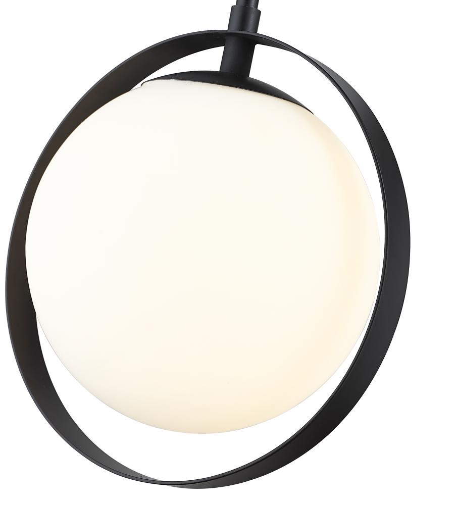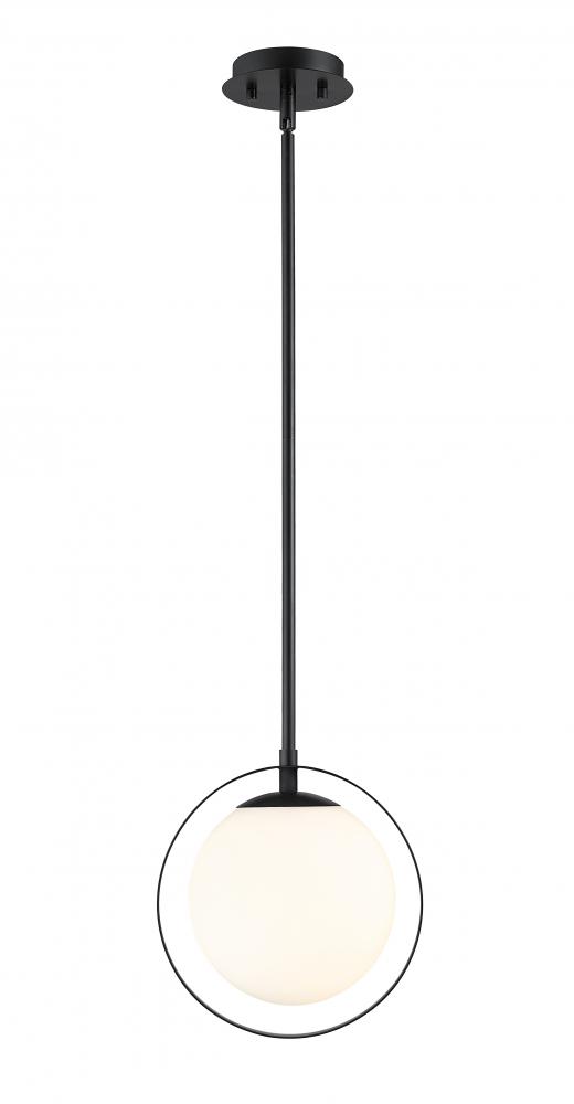 Send visual cues upward to capture a whimsical, charming look in a dining or main living space. Modern styling with strong industrial elements forms a delightful mini pendant light that lights up a compact kitchen, dinette, or reading space. A linear matte black finish steel frame sets the stage for a single matte opal glass globe bulb encased in an open steel ring to create mood-lifting ambiance that lends a hint of space-age personality to this enticing light.