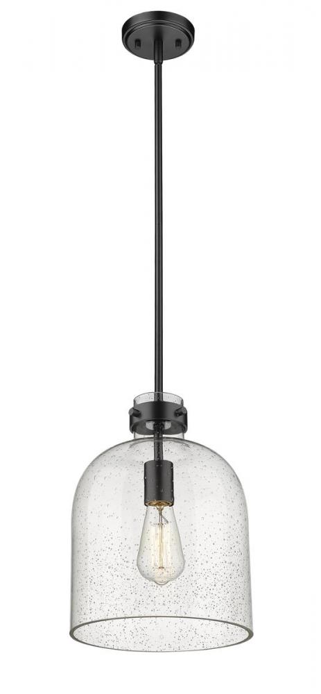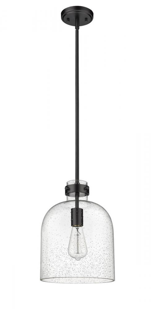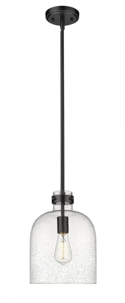 A one-light chandelier is sure to freshen up the allure of any dining room or kitchen area. The crisp and clean design features a dome shape seedy glass shade, steel construction and a matte black finish. This fixture is sure to serve as the centerpiece for modern and farmhouse spaces.