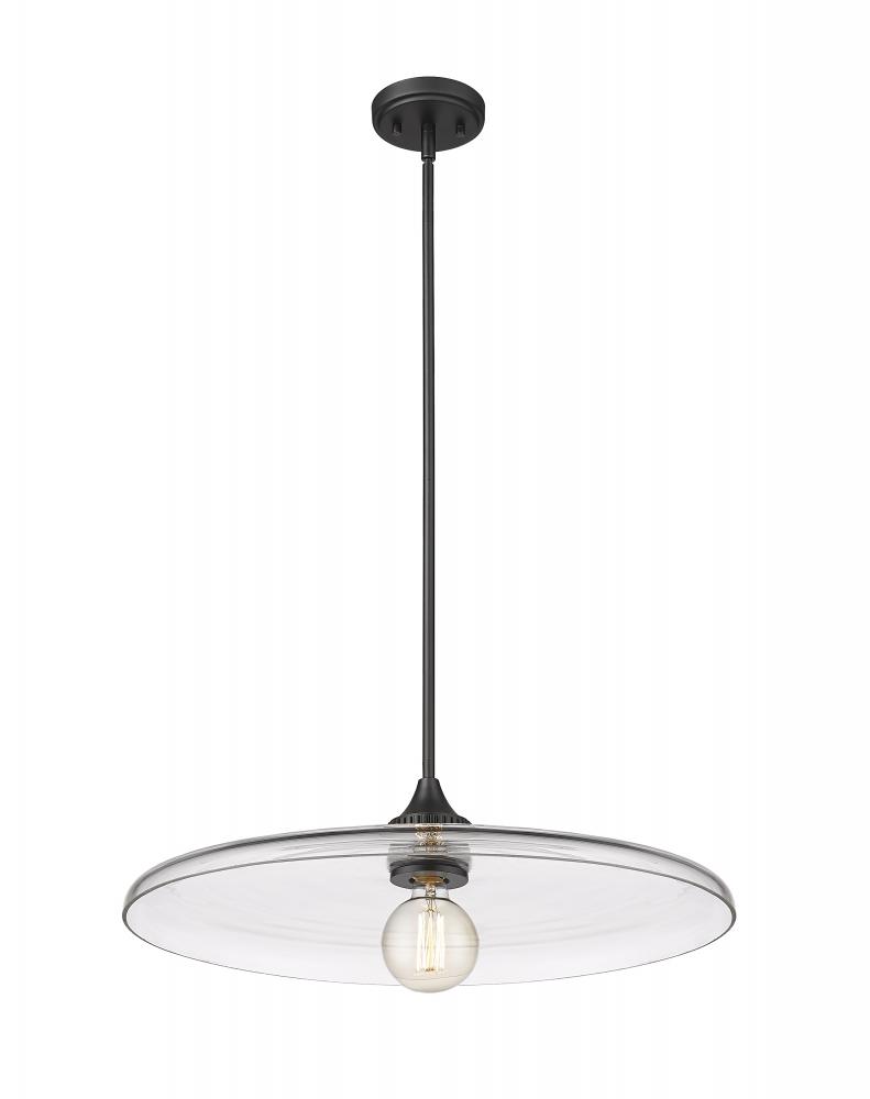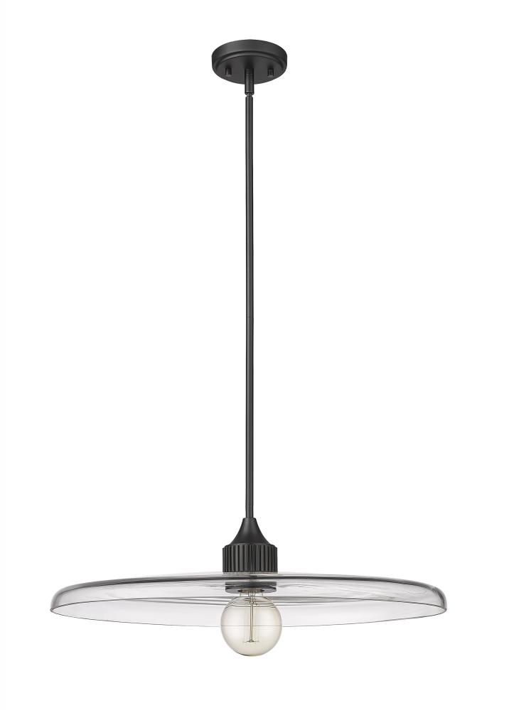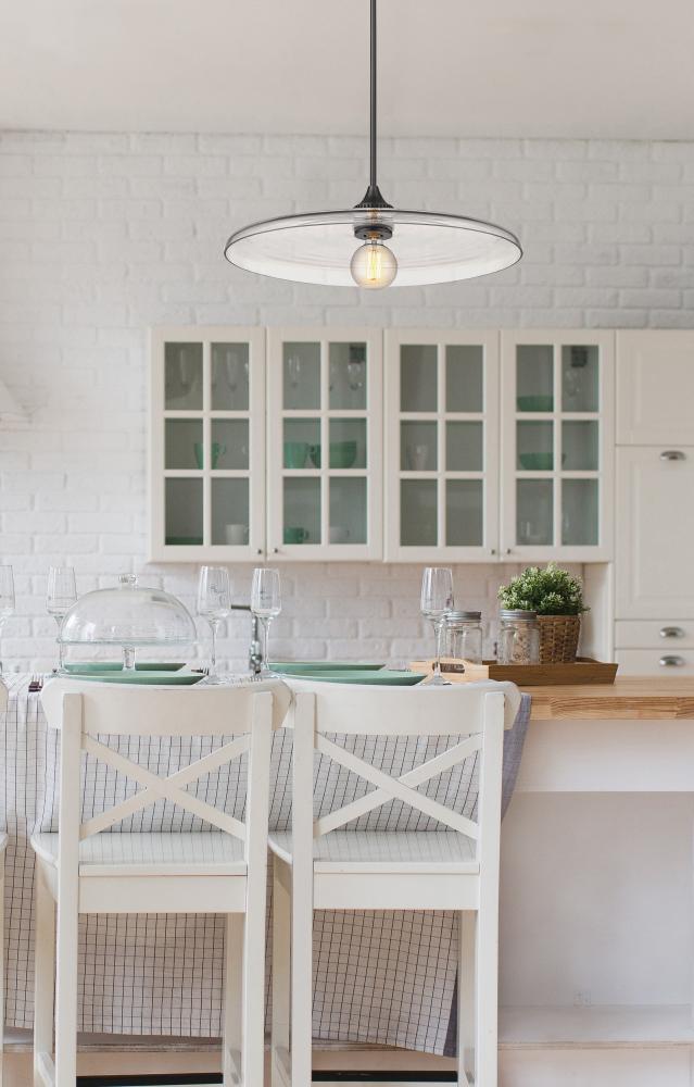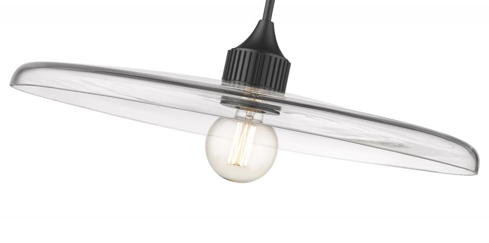 Smooth, clear glass creates a wide disc to deliver the true illumination of this modern one-light pendant. Delivering a compelling mix of whimsy and retro ambiance in any room, the fixture pairs a chic matte black finish with a simple, clean silhouette that promises bright illumination in a stylish but understated profile.