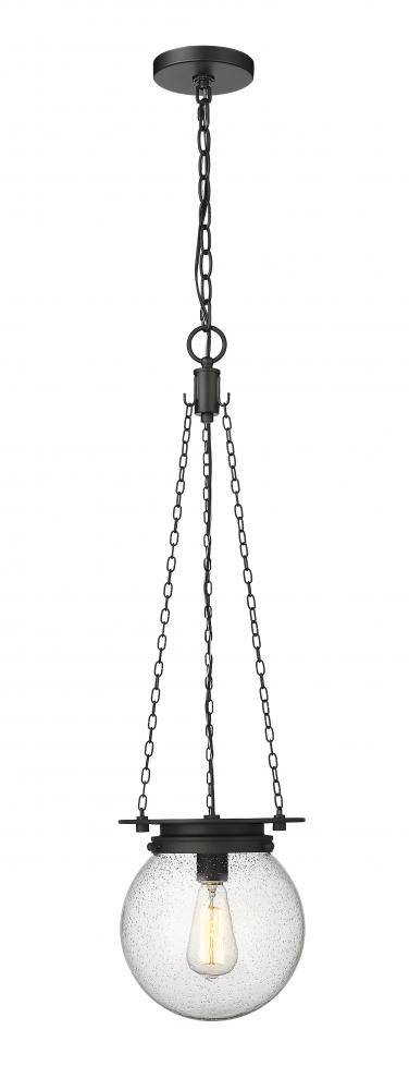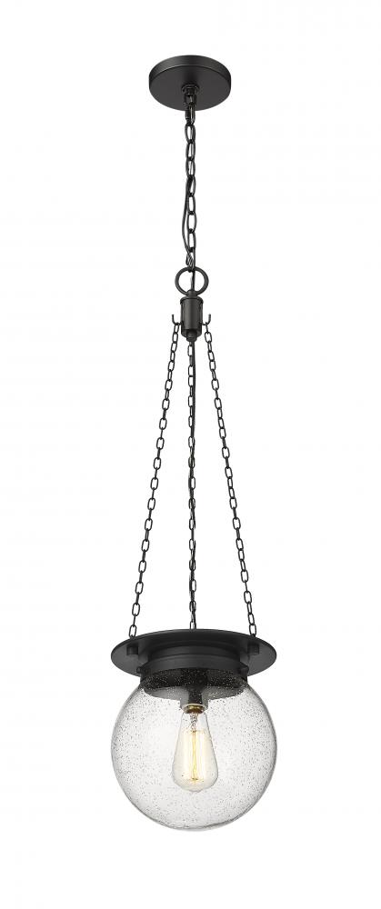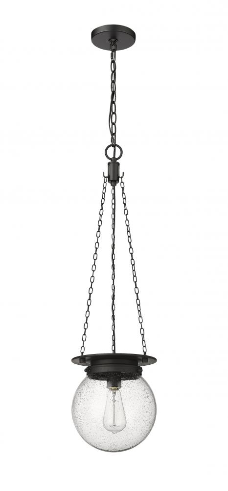 Add ambient lighting to an updated custom space with a light fixture blending Mid-Century Modern style with schoolhouse and industrial charm. This one-light pendant from the Calhoun collection delivers a shapely, symmetrical silhouette with a frame and accents featuring bold matte black finish metal. A festive clear seedy glass globe shade adds a dose of elegance suitable for a main living space, dining area, or foyer.