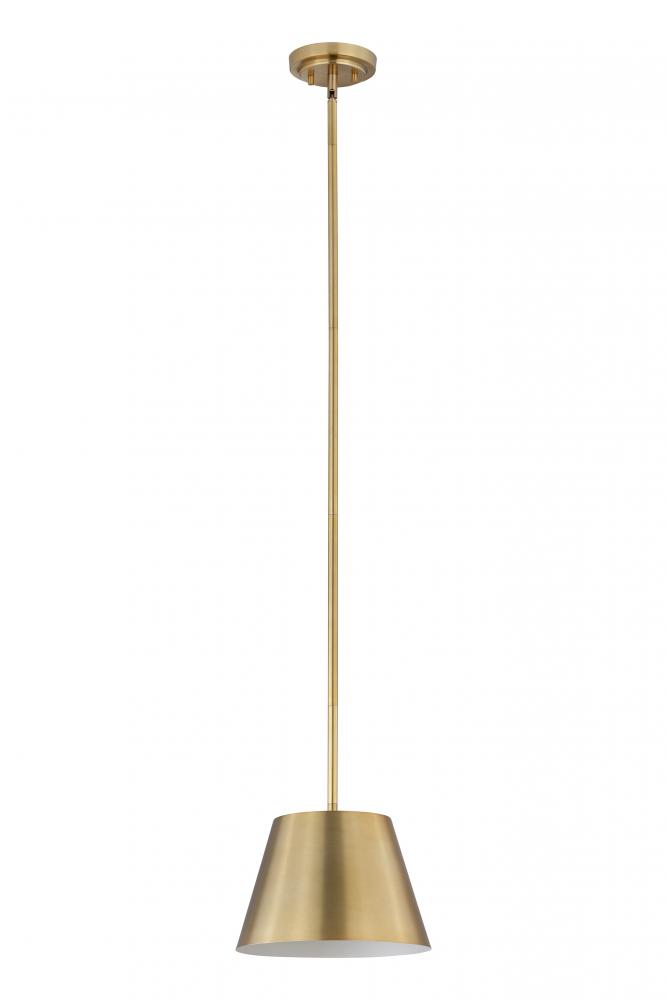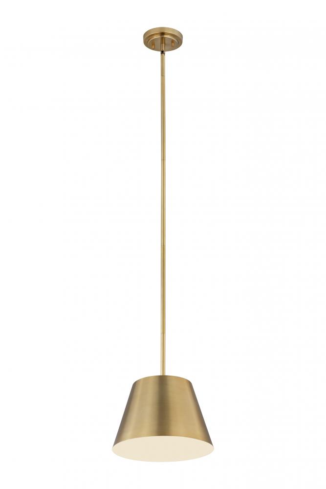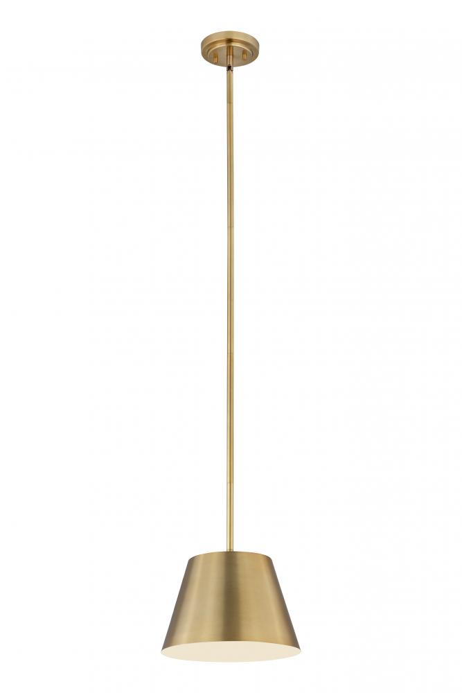 Chic in its simplicity, this modern pendant is a striking choice over a kitchen island, dining table, or living area. Refreshing in its rubbed brass with a white interior shade finish, the pendant features a compact profile with a round canopy and a modern empire shade that tapers gently to create versatile illumination.