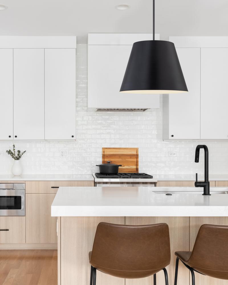 Bright, direct illumination radiates beautifully from a modern one-light pendant with a metal shade. The contemporary empire silhouette is exceptionally versatile as it offers a crisp matte black finish and a white interior for excellent lighting in any setting.