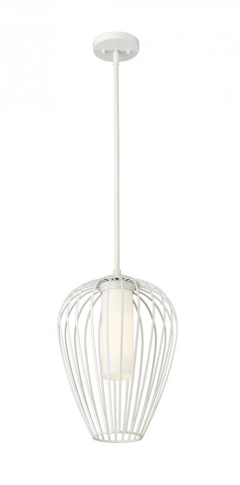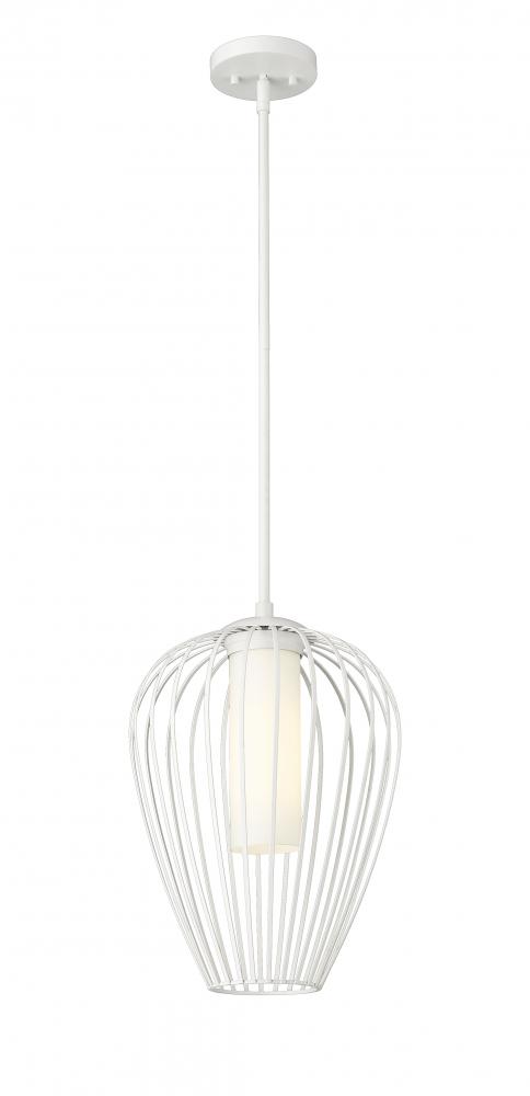 A charming modern tulip silhouette creates a sleek look and feel for a modern one-light pendant. Slender, curved spokes feature a cool textured white finish, while white opal glass within ensures soft, diffused illumination perfect for a bedroom or living area. Its a charming addition over a kitchen island.