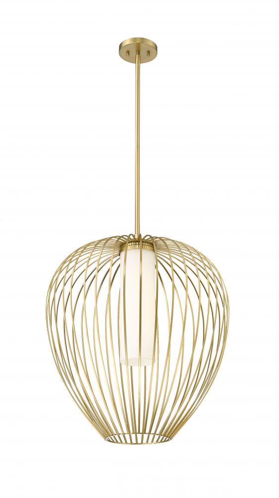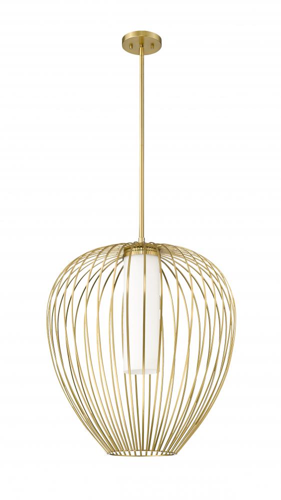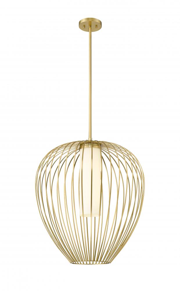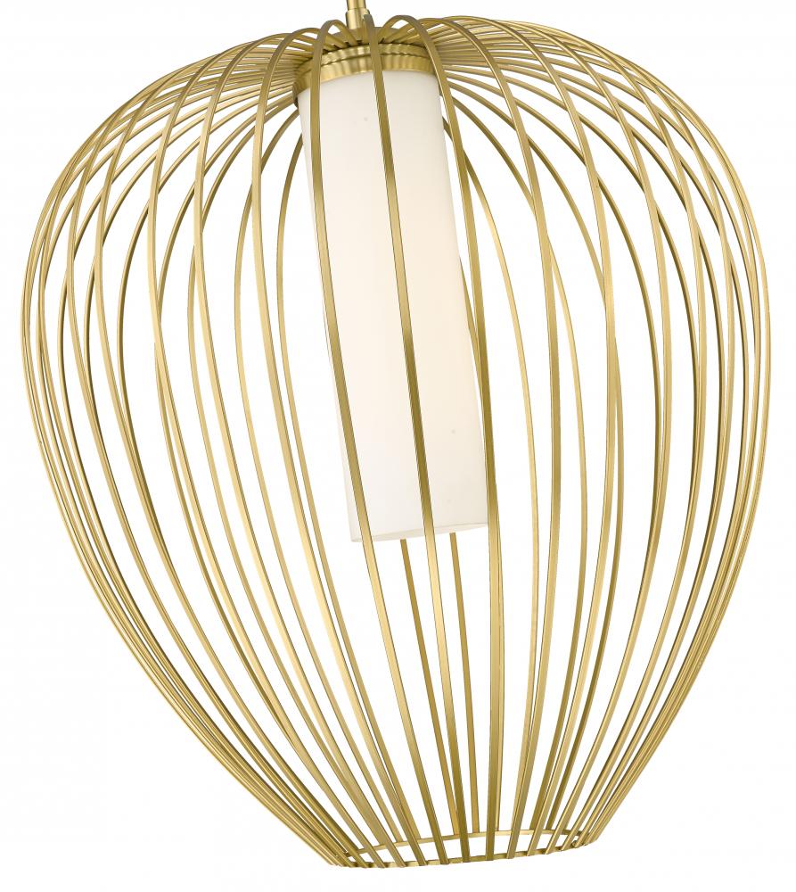 An inner shade of white opal glass create inviting illumination for a modern one-light pendant with big personality. Its outer cage frame features slender spokes that curve and taper to create a rounded silhouette, adding bold style over an island, or living room. The fixture features a rich modern gold finish to set a refined, sophisticated ambiance.