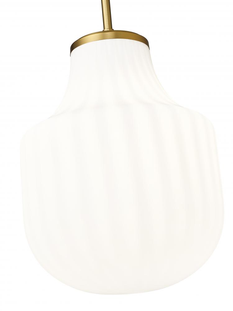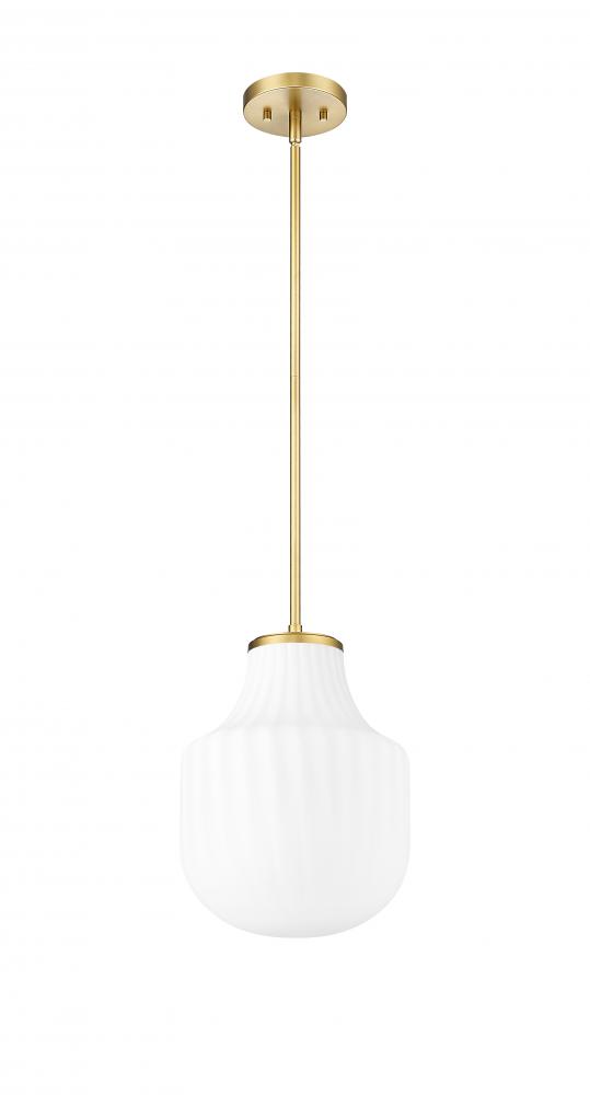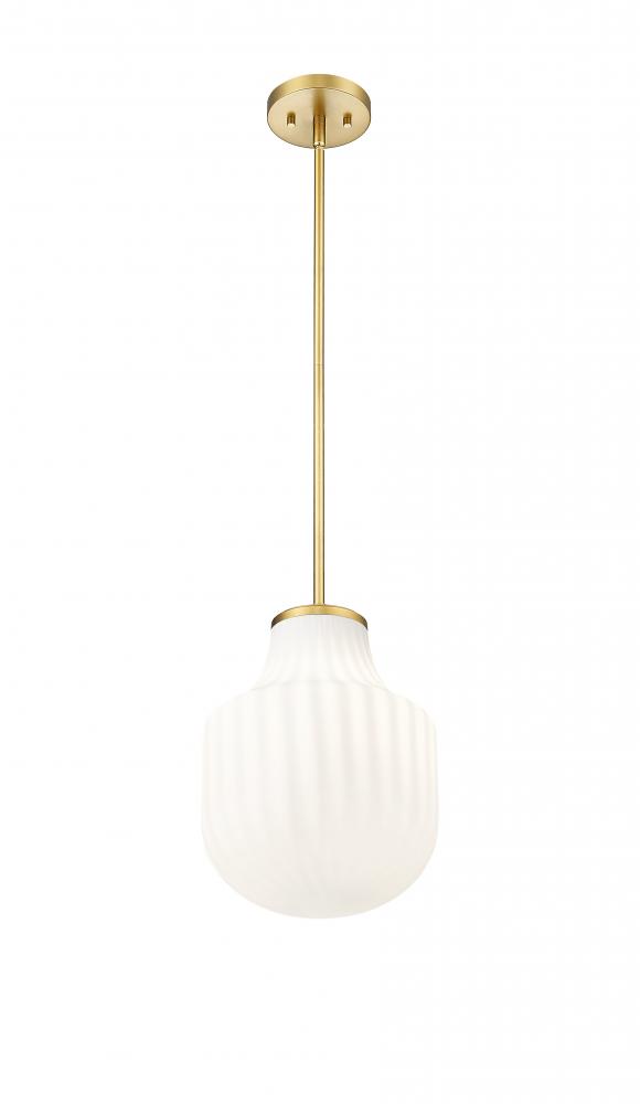 Delicate ribbing adds texture and depth to a modern schoolhouse glass pendant. In modern gold finishing over steel construction, the one-light pendant features opaque white glass that lends sophisticated contrast and depth while gently diffusing illumination for an inviting ambiance. Choose this pendant for a chic kitchen island or powder room.