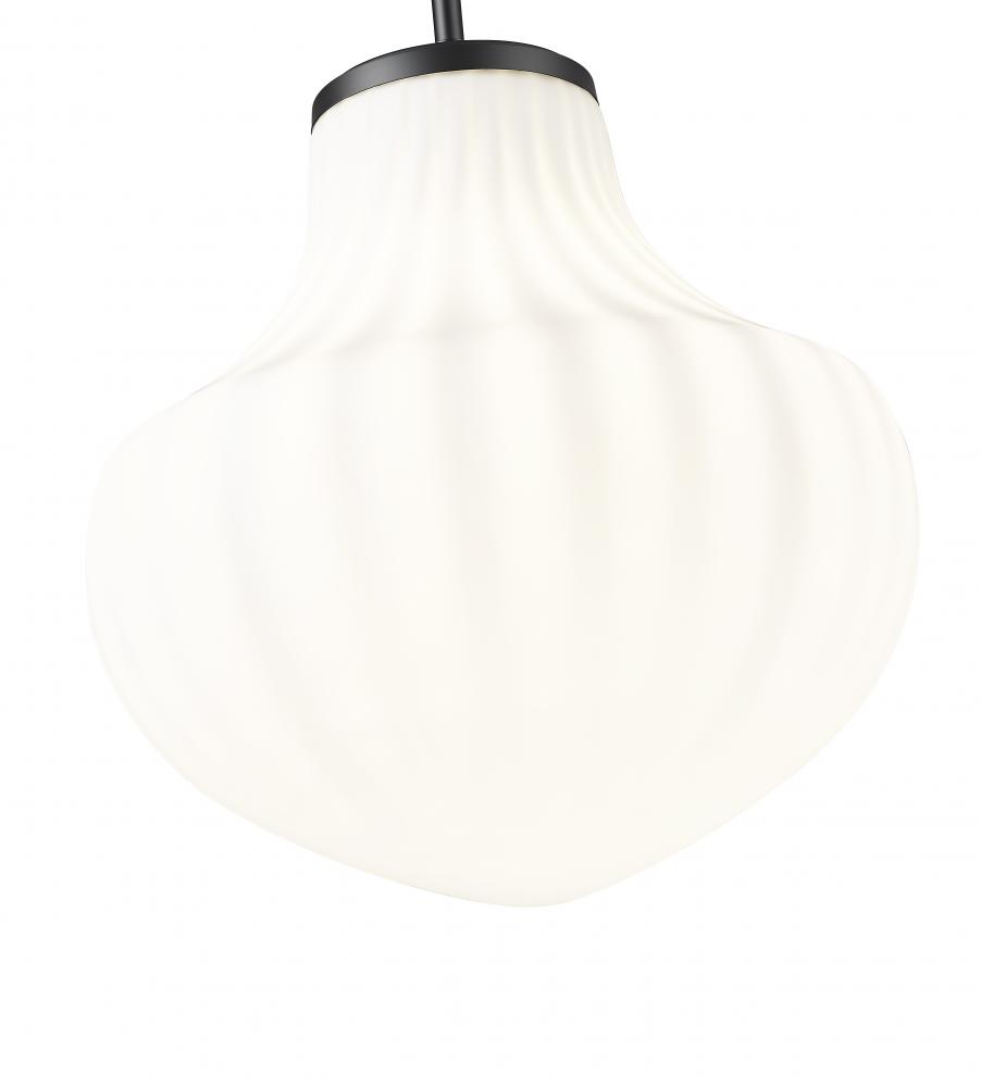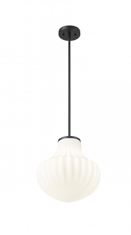 Generous size makes this modern one-light pendant the perfect choice for a stylish bedroom or living room seating group. Its a whimsical blend of updated schoolhouse vibes, complete with a compelling silhouette crafted in ribbed white glass. A contrasting matte black finish lends crisp character, perfect over a modern farmhouse or even an industrial design motif.