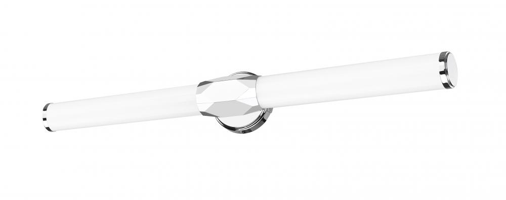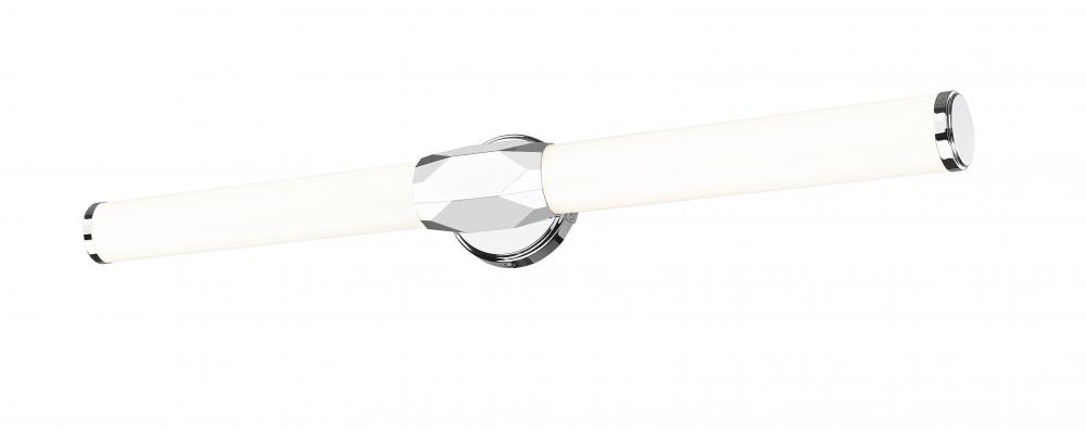 Decadence alters the minimalist design of an Art Deco-inspired one-light vanity light. Aluminum framing with a brilliant chrome finish includes end caps and a prism-inspired holder, furthering the rich geometric and complete package of a light fixture with optional color temperature values.