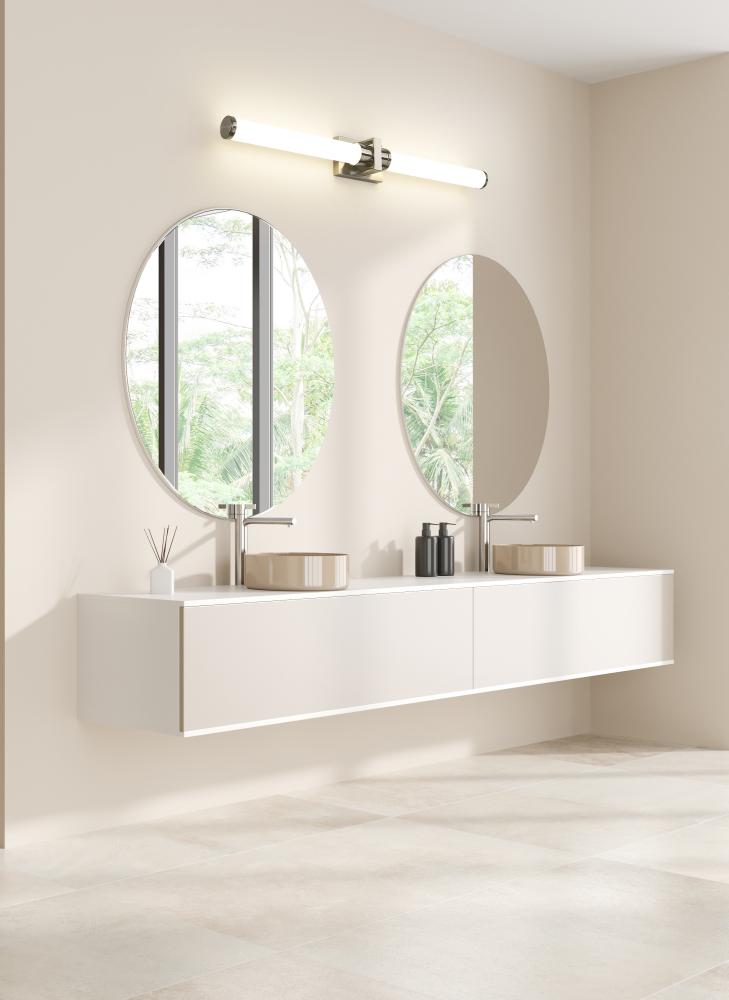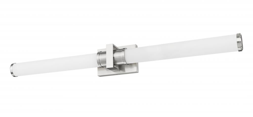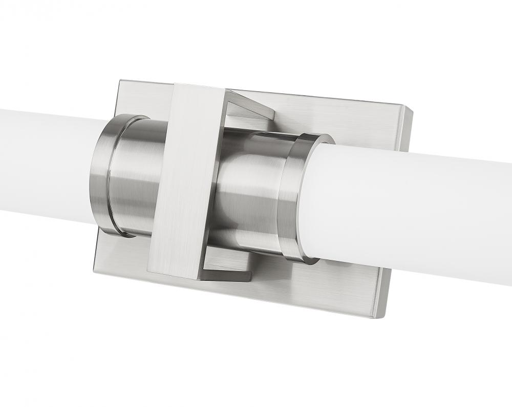 Introduce stylish, energy efficient illumination with this modern LED vanity bath light. Its generous size pairs with cylindrical opal glass shades and a brushed nickel finish to create a chic look and feel in your bath. The fixture is complete with a decorative cuff and end caps on the glass, adding stylish dimensionality and flair to its refined silhouette.