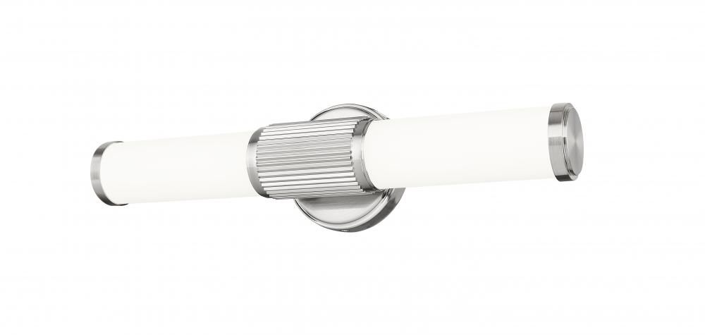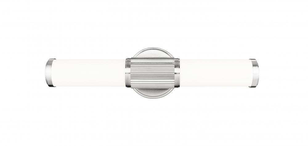 Fluted and smooth design elements create impeccable textural contrast for a modern LED vanity bath light. A sleek brushed nickel finish highlights its steel construction, which boasts a beveled wall plate and decorative end caps. From the Solange collection, this sconce is a chic choice that offers inviting illumination with opal glass shades.