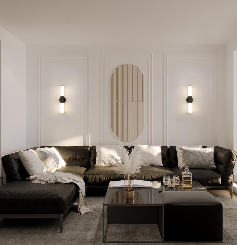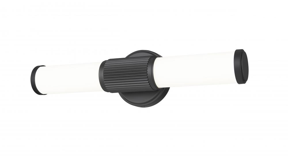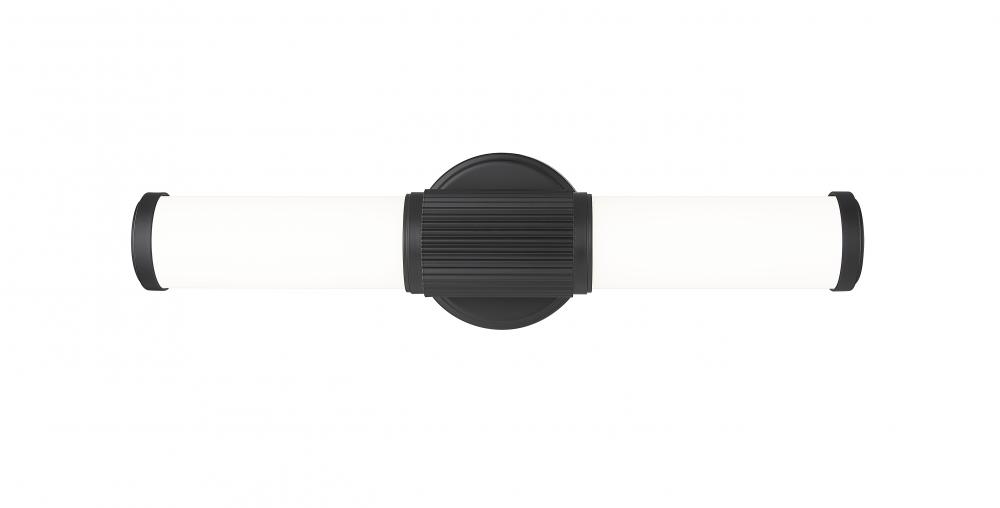 Textural contrast and a smooth matte black finish are an eye-catching combination for this modern LED vanity bath light. A pair of opal glass cylinder shades create bright, indirect illumination, while the energy efficient LED is ideal for contemporary homes. The fixtures steel frame boasts a beveled wall plate and decorative end caps, with a fluted cuff that brings an artistic touch youre going to love.