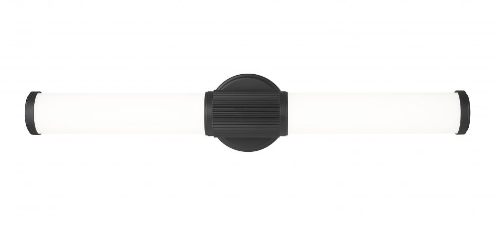Smooth and fluted textural contrast creates a stylish presentation for this modern LED vanity bath light. It showcases a matte black finish, delivering a hint of industrial flair to your bath. Its fluted cuff and beveled wall plate are augmented with decorative end caps, adding a finished look and feel. The opal glass diffusers ensure wonderfully welcoming illumination while adding a hint of contrast and depth.