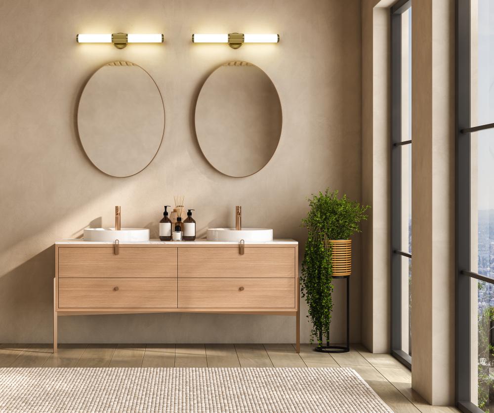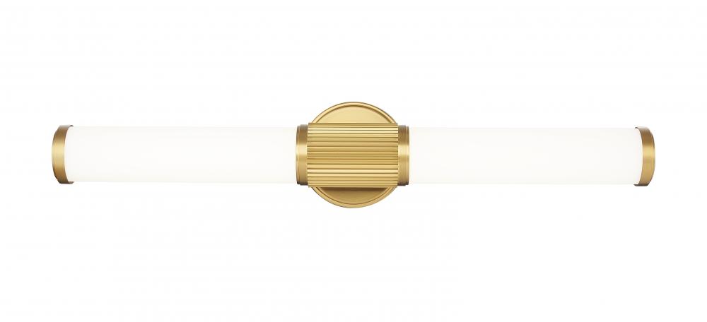 Sophisticated warmth infuses a modern LED vanity bath light. Perfect for primary or guest en suites, it shows off a modern gold finish thats rich and refined, perfect for a soothing spa-like look and feel in your home. Opal glass cylinder shades complete the look, held in place with a fluted cuff that adds decorative allure.