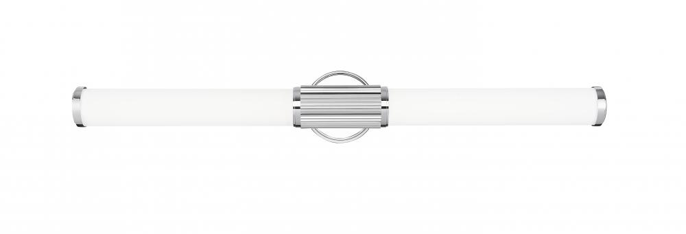 Robust lighting and beautiful details pair to perfection in this modern LED vanity bath light. Its generous size is created with a pair of opal glass cylinder shades, casting soft, inviting illumination. A chrome finish shines in the light and adds dimension to a fluted cuff and smooth beveled wall plate.