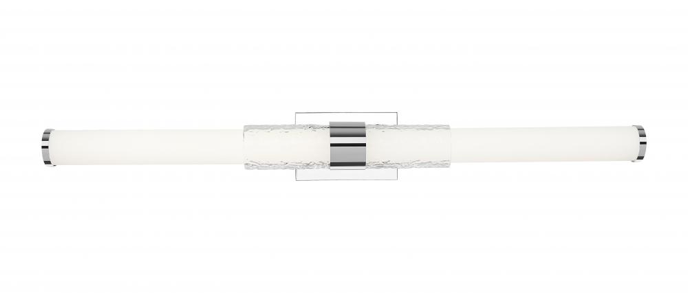 Chrome adds a sleek, high-shine edge to this expansive vanity light, while rippling glass diffuses light with delicate movement. The glow is balanced, flattering, and full of modern charm. Its a stunning piece that amplifies both space and style.