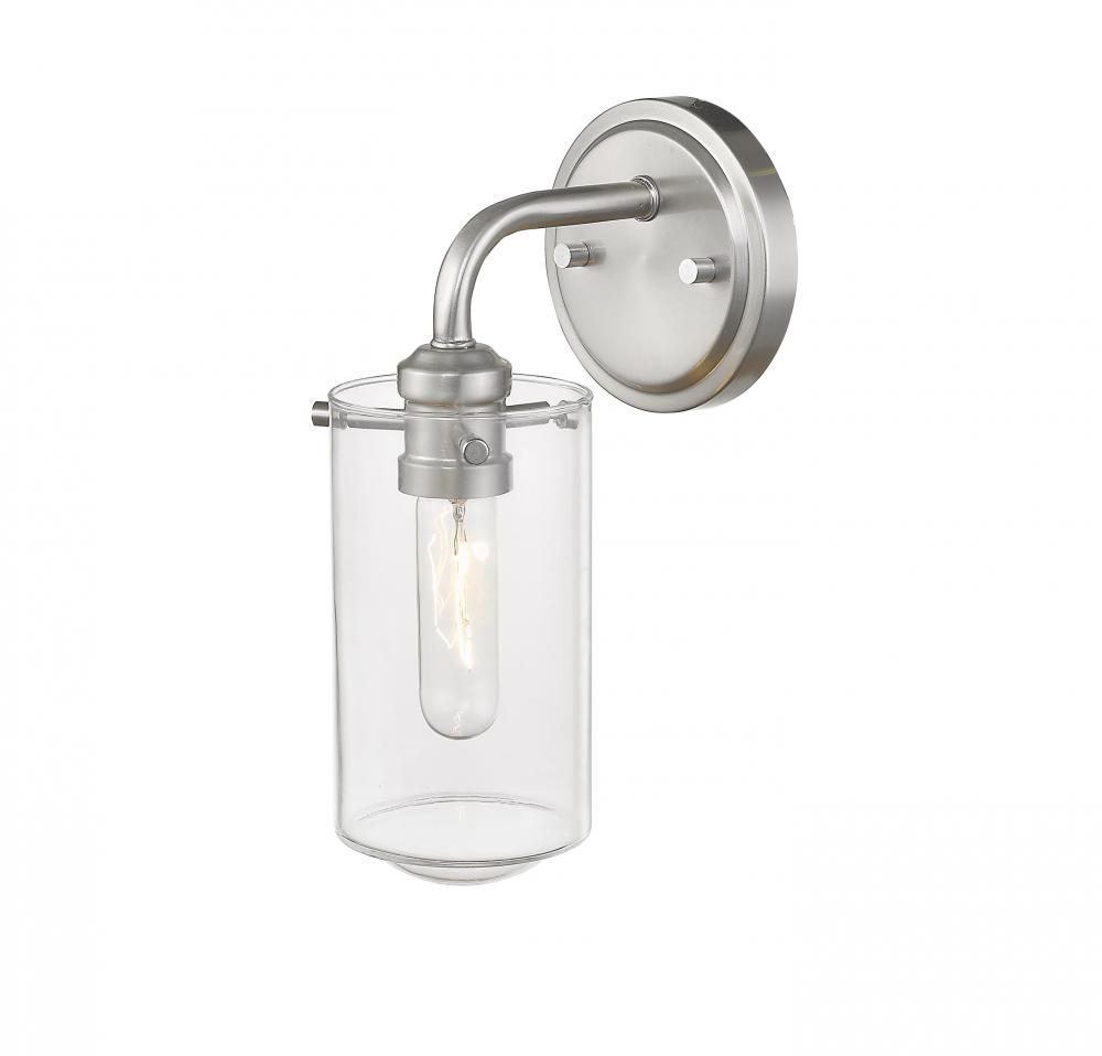 Gleam and radiance show how accent lighting can work to your advantage. Place this brushed nickel and glass wall sconce in a bath or living area to offer spot lighting and continue an urban industrial decor theme.