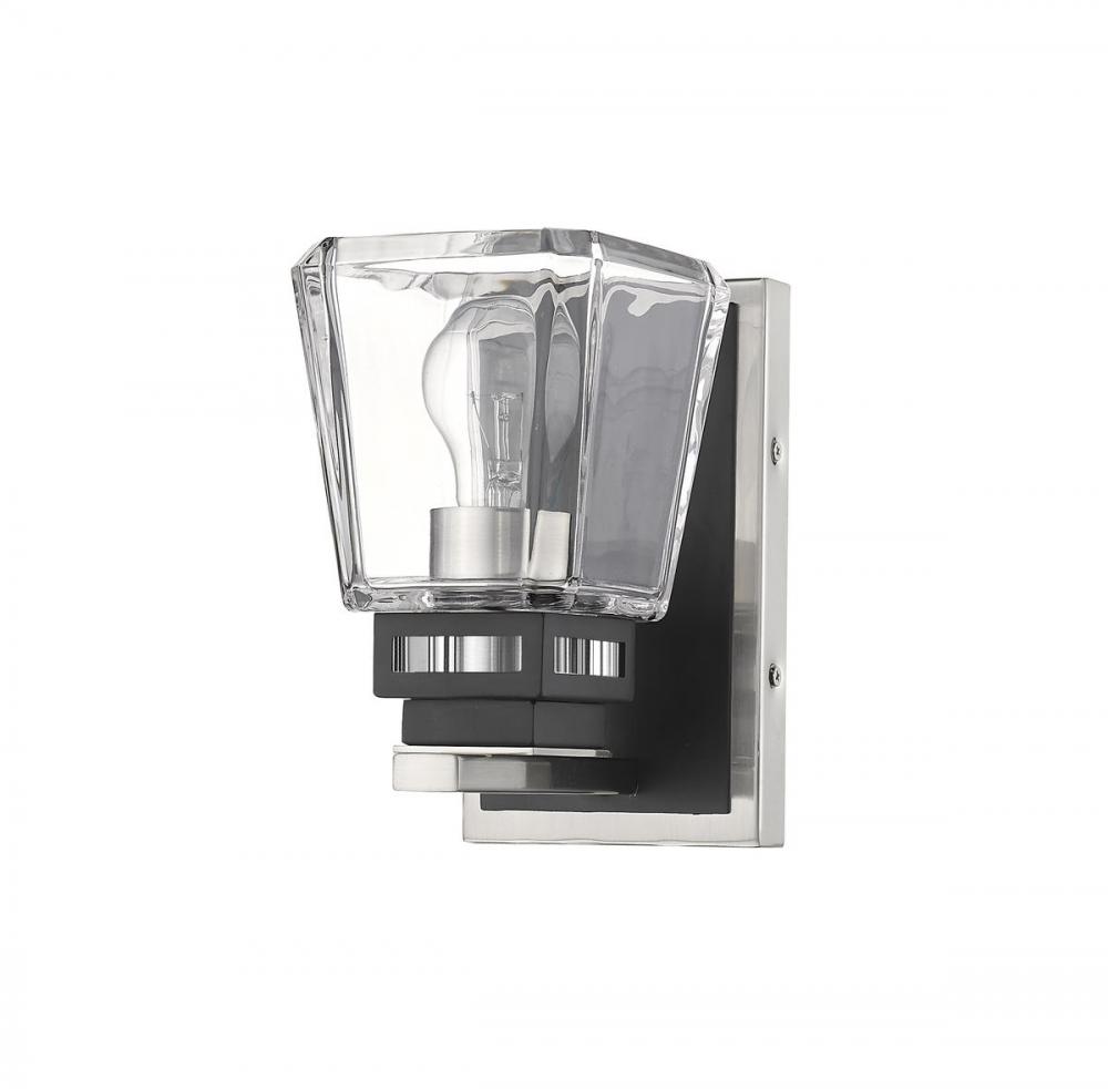 Linear design elements with elegant materials deliver a must-have look for a custom living space. Mid-Century Modern flavor stylizes this one-light wall sconce, showcasing a thick square glass shade mounted to a Brushed Nickel finish frame with a Matte Black surface.