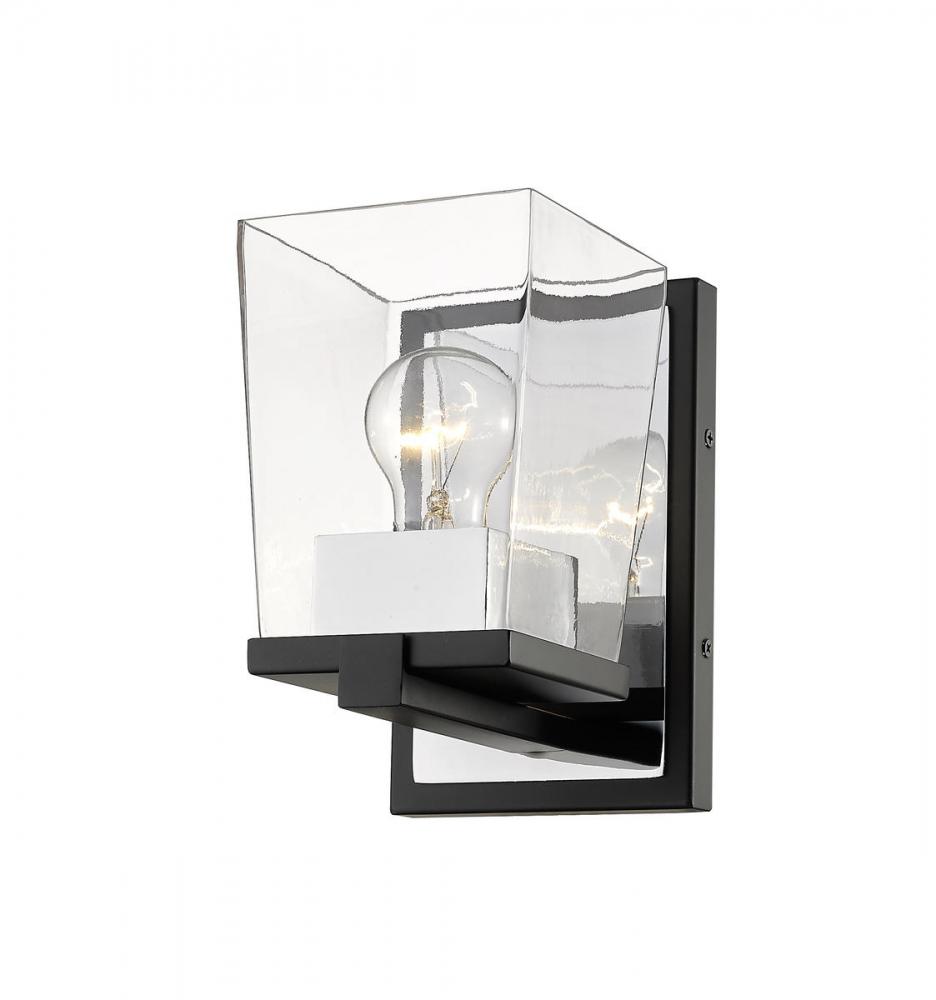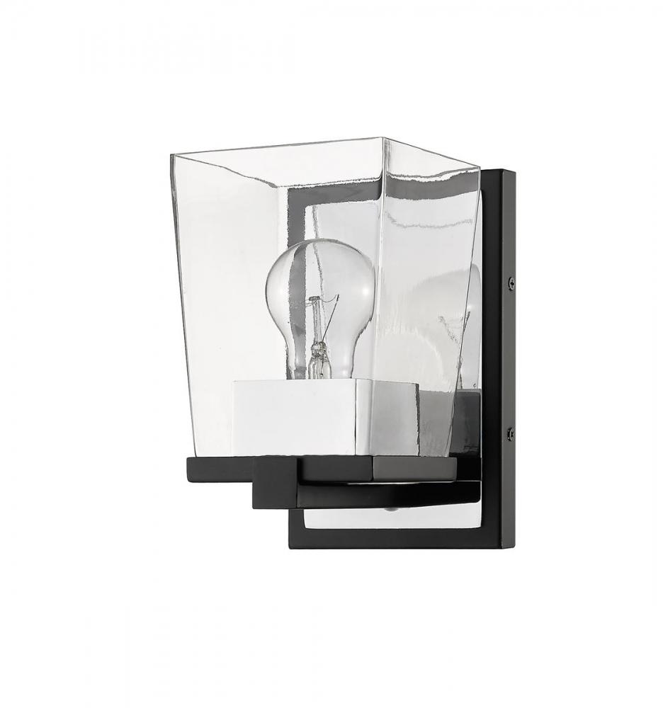 With a sleek cosmopolitan attitude and a beautiful blend of glass and metal, this one-light wall sconce offers a sophisticated way to stylize a contemporary space. Matte Black and Chrome serve as stunning finishes for a brilliant fixture with a geometric silhouette and a contrasting palette.
